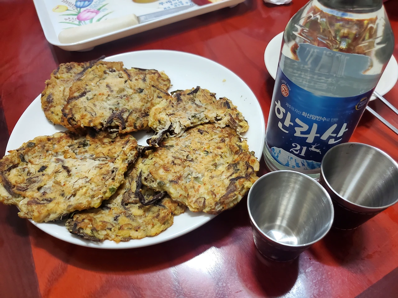 집에 돌아온 우리는 제주에서의 첫날을 기념하기 위해 엄마의 냉장고에서 안주거리를 꺼내 21도짜리 한라산 소주 뚜껑을 땄다. 내가 제일 좋아하는 녹두빈대떡과 마트에서 사 온 돼지고기 통삼겹 그리고 다시 메밀묵이 첫날 술자리의 안주가 됐다. 이 꿀맛을 어찌 잊을 수 있을까? 요즘 표현으로 개피곤한 몸을 순식간에 녹초로 만들어준 한라산 소주. 그 덕분에 기절했고 다음날 아침 개운하게 기상할 수 있었다.