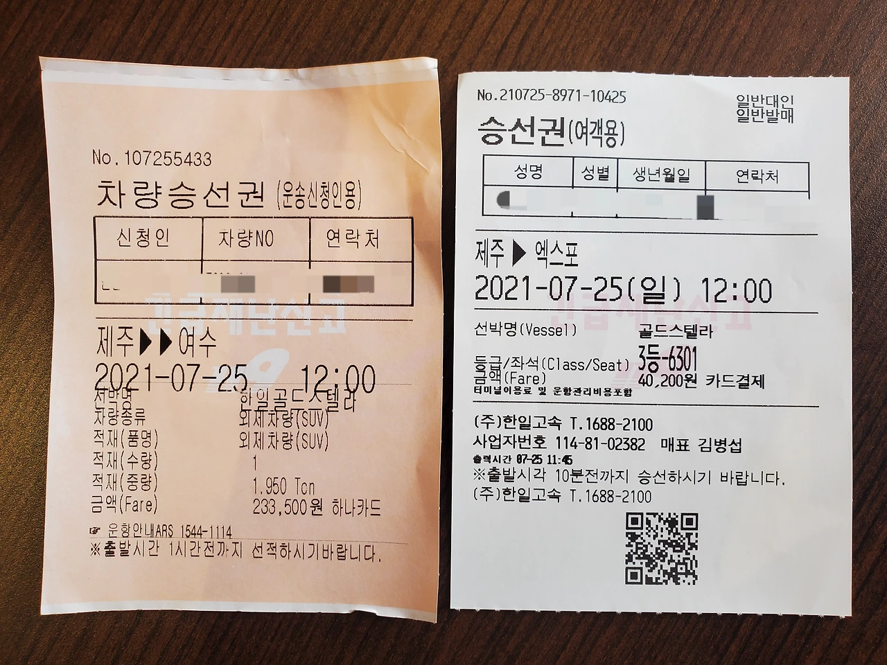 예매를 새로 한 영수증을 살펴봤다. 가격이 조금 저렴해 진 듯했지만 딱히 그런 것도 아닌 것 같았다. 차량과 여객은 승선권을 따로 지불해야 한다.