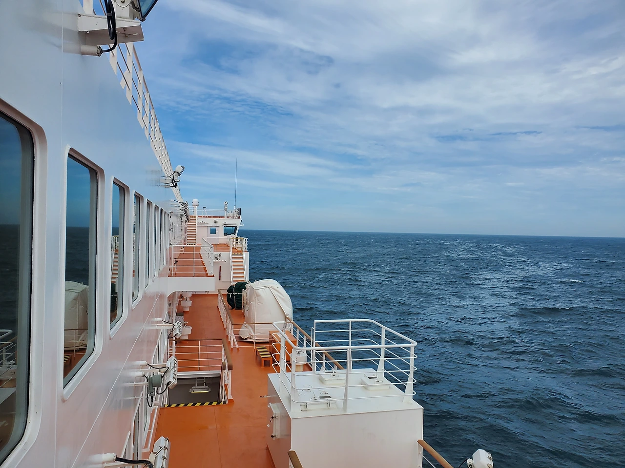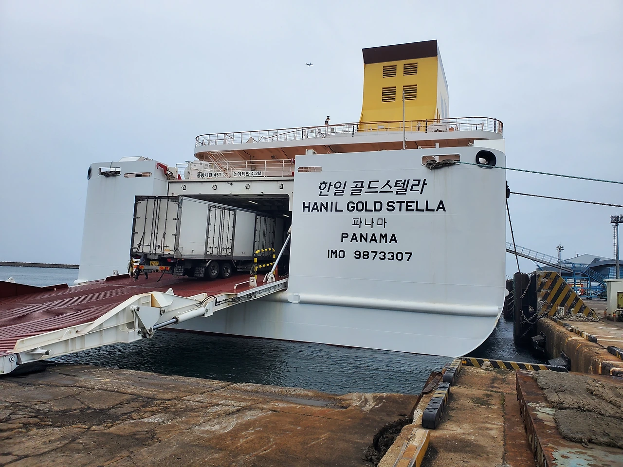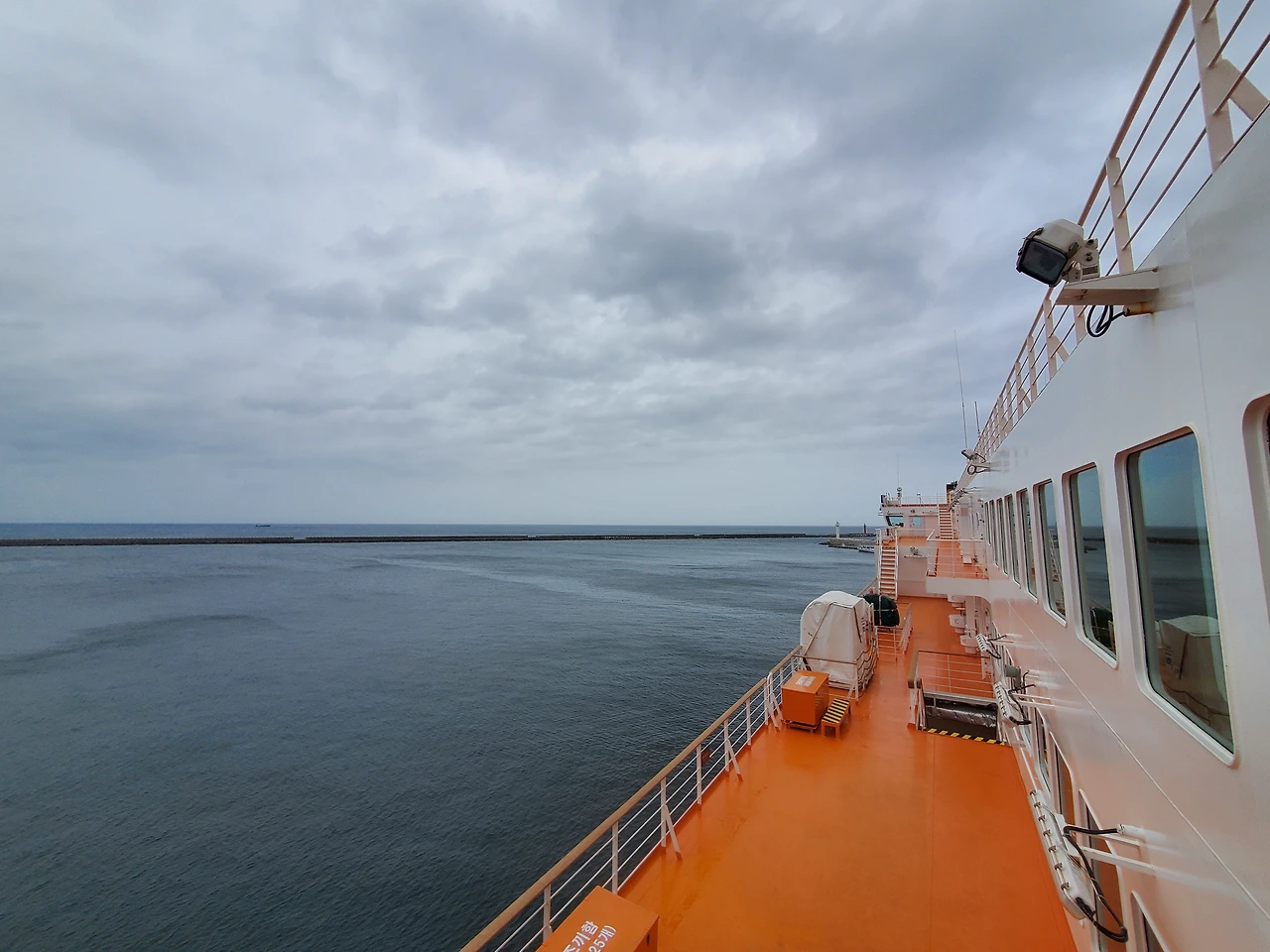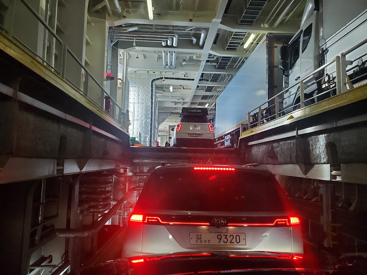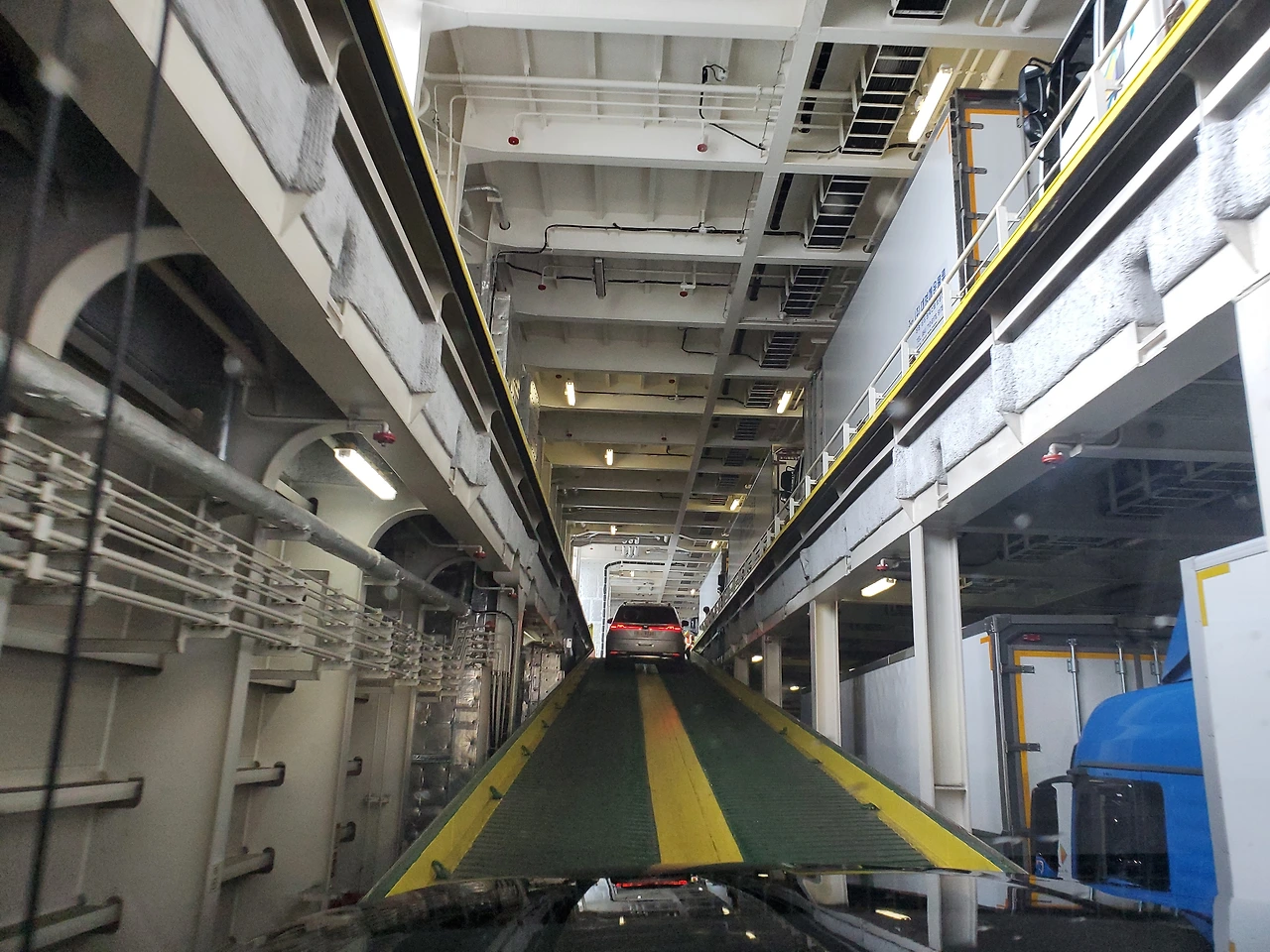 카페리는 차를 먼저 싣고 사람이 탄다. 사진에 보이는 층간 슬로프가 나중에 나를 곤혹스럽게 했는데 차를 실을 때와 내릴 때 슬로프 방향이 바뀐다. 운항 중일 땐 슬로프는 위로 올려져 평지가 된다. 차 찾을 때 이런 걸 안내해주면 좋으련만 크지도 않은 배 안에서 차 찾느라 얼마나 진땀을 뺐는지 모른다.