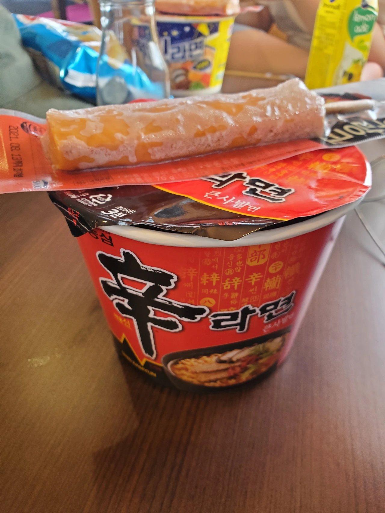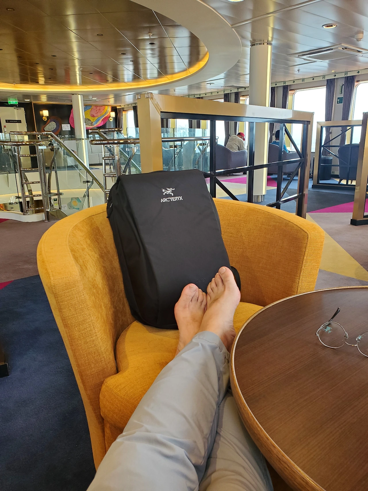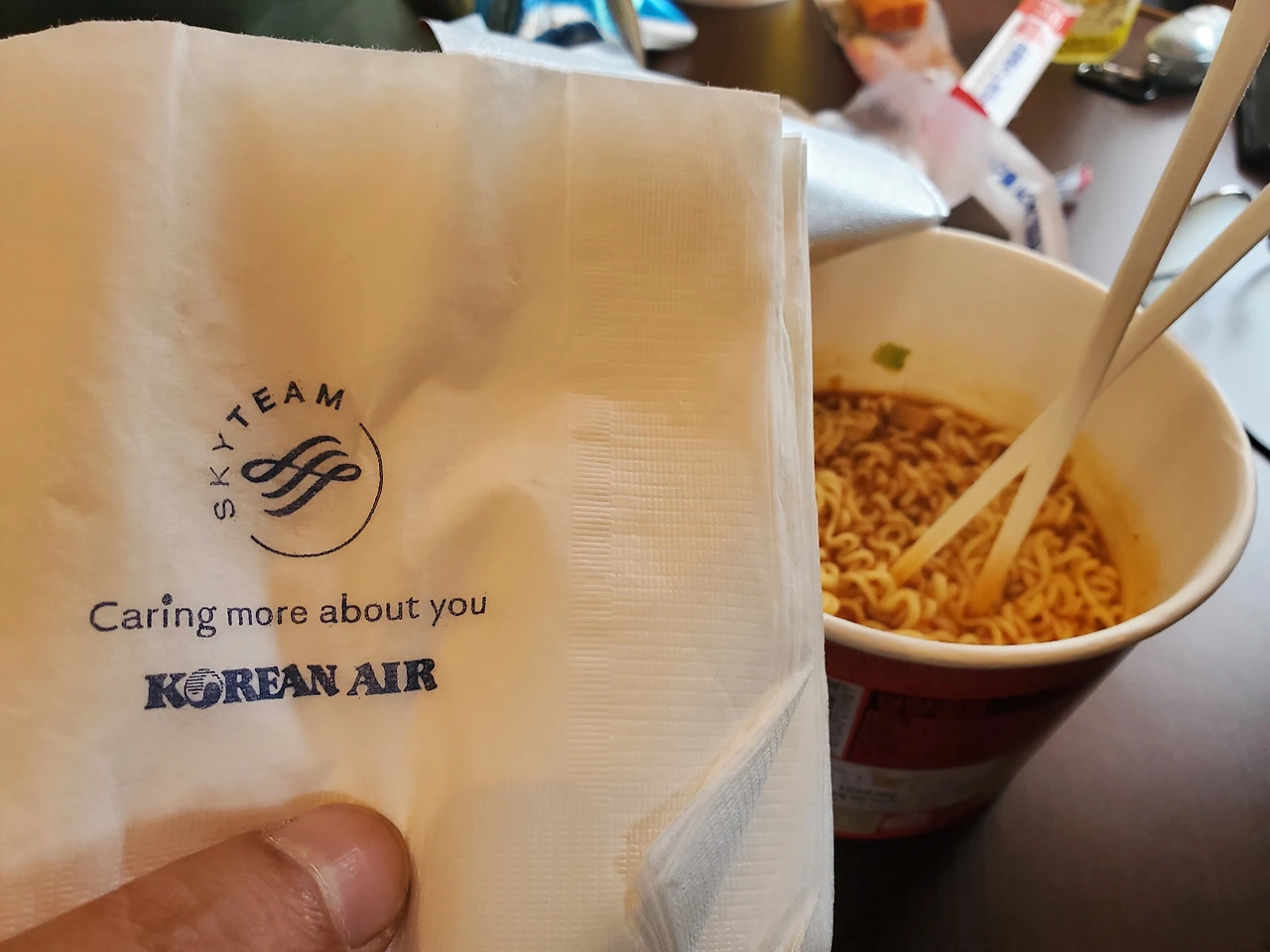 배 안에는 매점도 있다. 이렇게 컵라면도 먹을 수 있으니 얼마나 다행인지 모른다. 인천에서 제주로 가는 세월호가 있었을 땐 12시간을 가도 편했는데 새로운 선박이 건조되었음에도 아직까지 허가를 내주지 않는 정부는 대체 뭔 생각인지 모르겠다. 가방에서 티슈를 찾아보니 대한항공 라운지에서 가져온 게 있었다. 배에서 대한항공이라니 웃긴 조합 같았다.