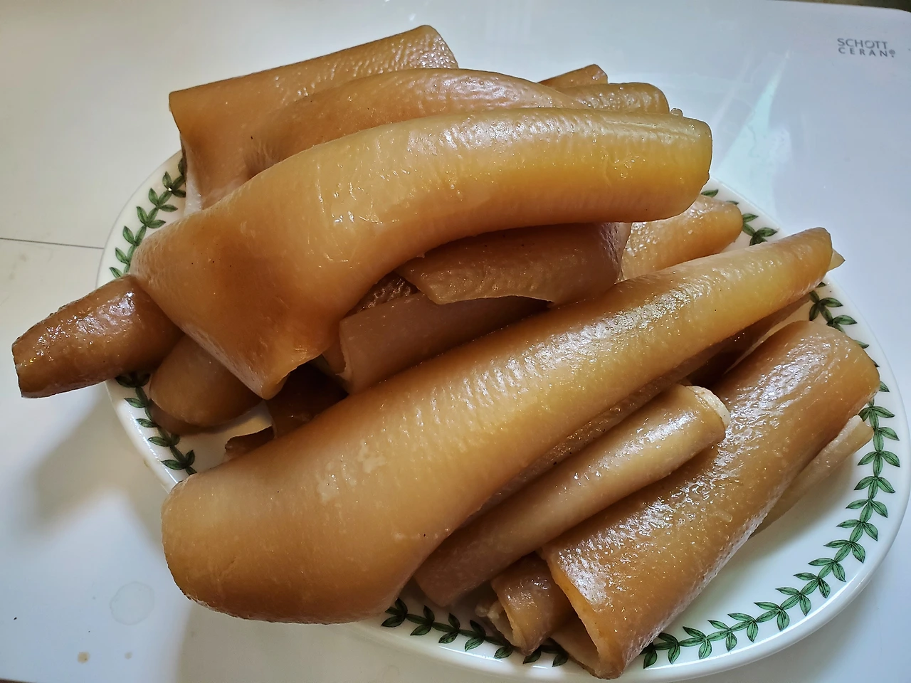 좀 더 식힌 후 이 상태로 접시에 담아 점심식사 차림이 되었다. 따듯할 땐 야들야들한 식감이고 식으면 쫀득한 식감이다. 취향에 따라먹으면 될 것 같은데 난 야들야들한 게 더 좋은 것 같았다.
