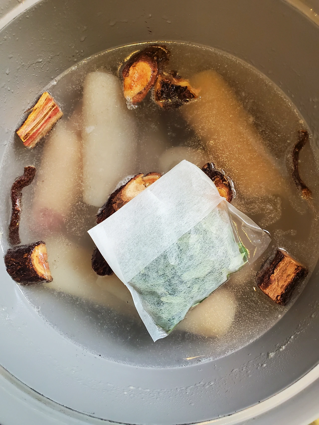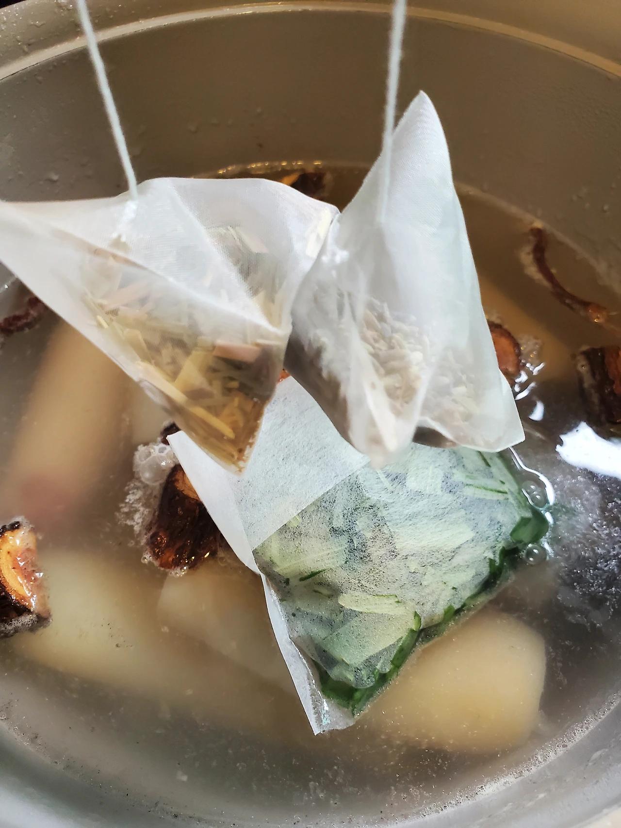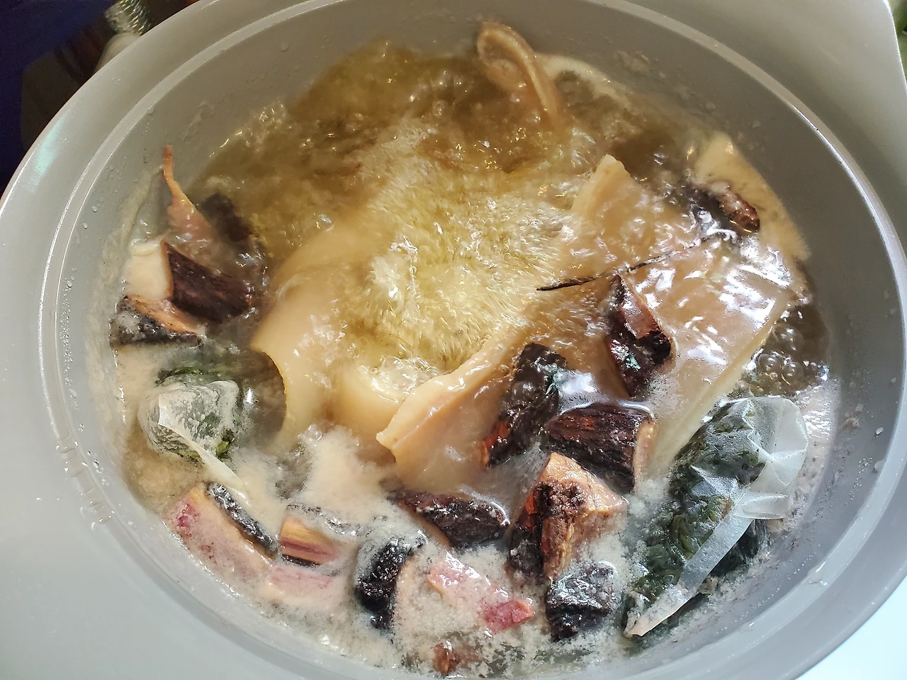 이것도 수육처럼 끓여야 할 것 같아서 내가 평소에 쓰는 재료를 넣었다. 참다래 넝쿨과 라벤더, 레몬그라스를 투하시켰고 이번엔 추가로 제주도 조릿대 새싹 말린 걸 다시백에 담아 넣었다. 이건 뭐 보약이나 다름없게 생겼다.