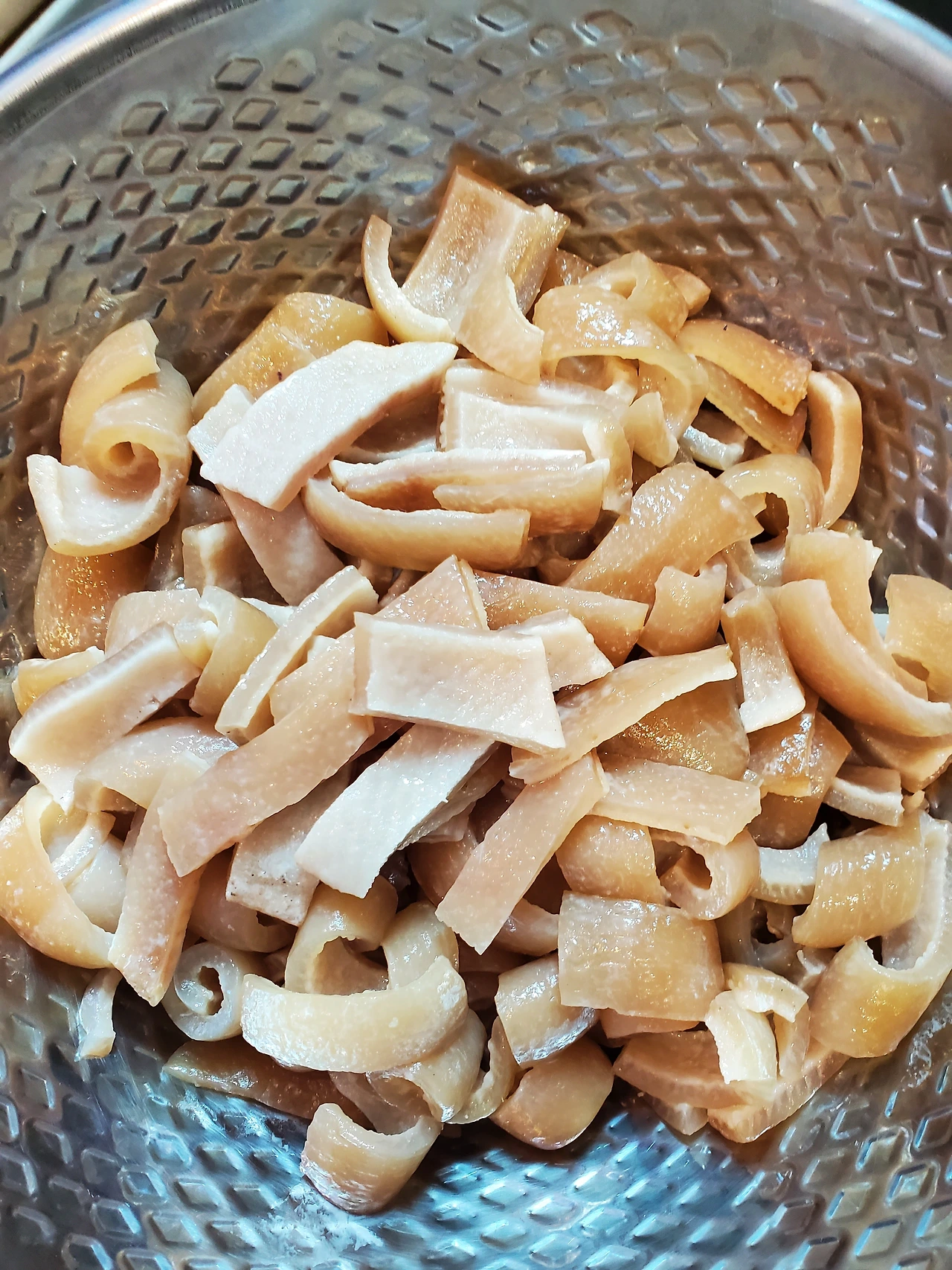 너무 뜨거워 그릇에 담은 상태로 식혔다. 삼십 분 정도 식힌 후에 보니 돼지껍데기 색깔이 맛깔스럽게 변해 있었다. 도마 위에 올리고 무작위로 자르기 시작했다. 모양 같은 건 아무런 의미가 없었다. 보통 식당에서는 한 판째로 불판에 굽지만 매콤한 반찬을 만드는 게 목표였다. 나중엔 양념을 해서 구워 먹는 걸 시도해 봐야겠다.