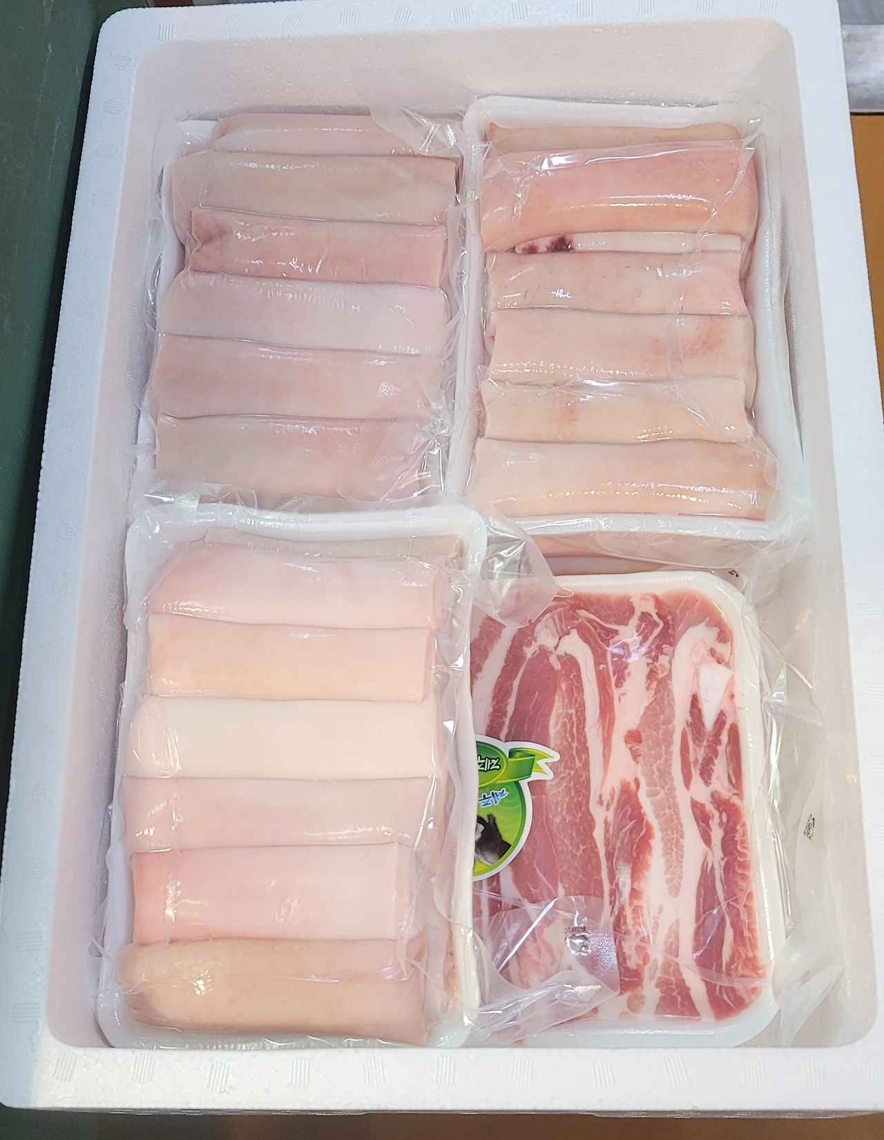 양이 너무 많아서 이 집 저 집 나누고 세 팩만 냉장실과 냉동실로 보내졌다. 흑돼지 오겹살은 점심에 먹는 걸로... 그런데 술안주로나 먹던 돼지껍데기가 반찬으로도 이용될 거라고 하니 만감이 교차했다. 술안주가 반찬으로 올라왔으니 소주를 까야 하나? 흑흑~ 회사에서 소주병을 까는 건 위험한 발상이다.