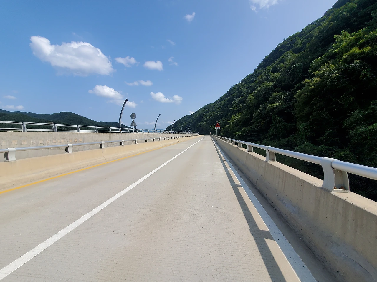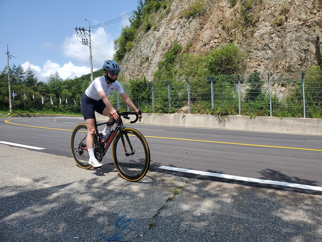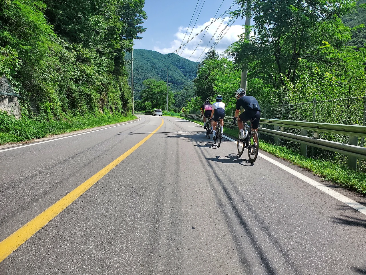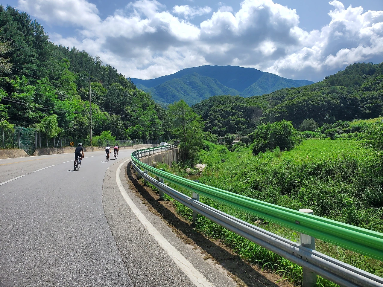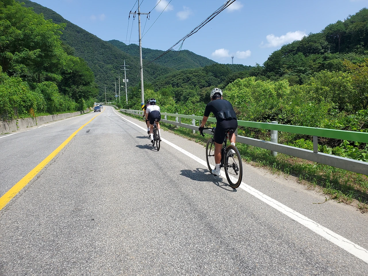 도마치재에서 화천 방향으로 이어지는 긴 다운힐 후 도로는 비슷비슷한 풍경이 지속됐다. 빽빽하게 솟아오른 산과 도로 옆으로 우거진 수풀이 전부였다. 식사 후 충분히 쉬어서 그런지 체력은 거의 완충된 거나 마찬가지였다. 더군다나 평소엔 먹지도 않던 에너지 관련 보조제를 꾸준히 먹으며 달리니 체력이 부족할 리가 없었다.