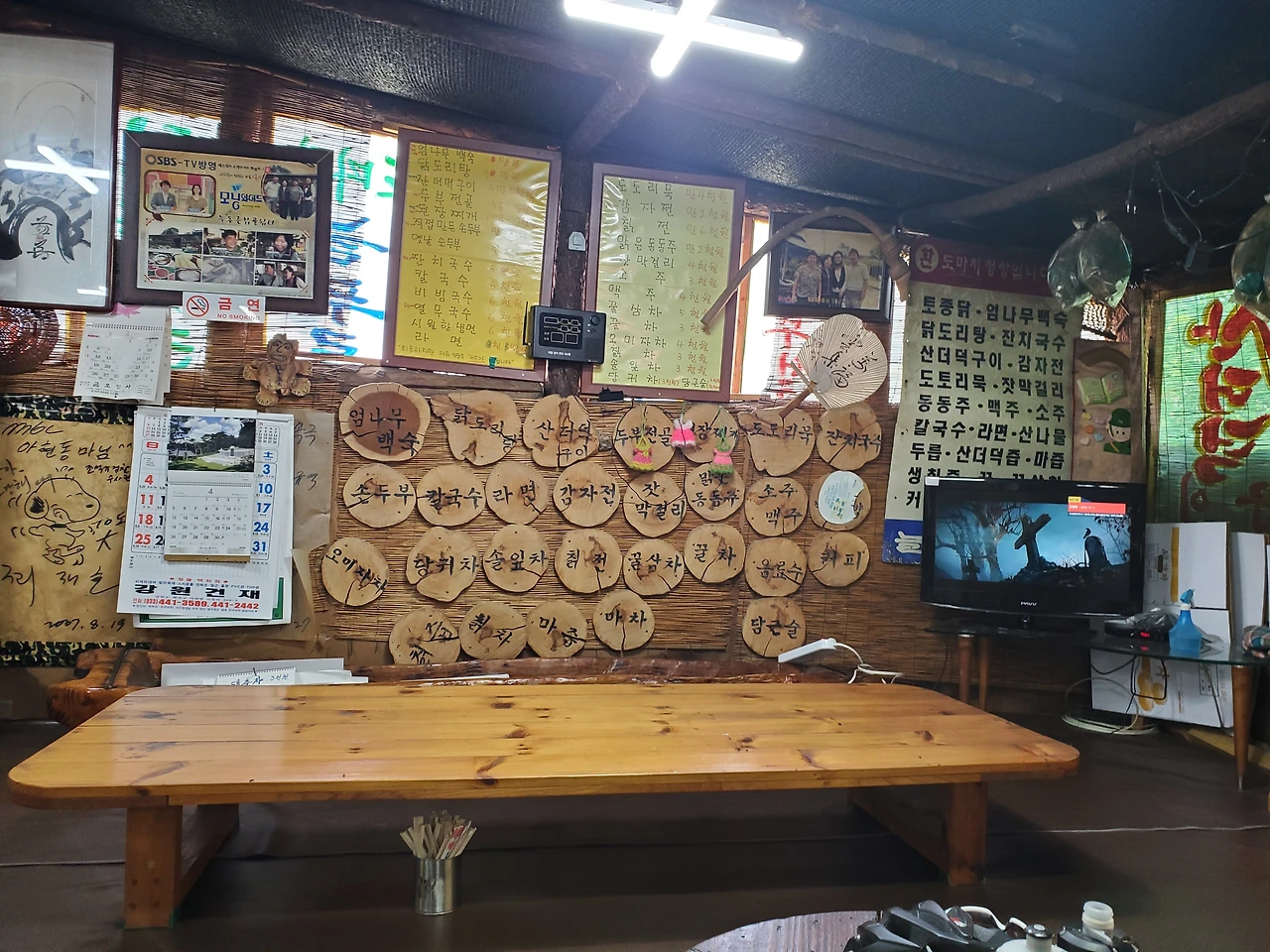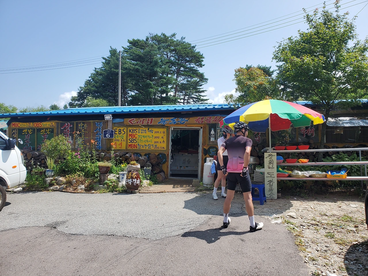 원 계획으로는 도마치재를 내려가 점심 식사를 하는 것이었는데 기재 불량의 두 사람의 탈진에 가까운 상태 때문에 어쩔 수 없이 도마치재 정상에 있는 허름한 식당으로 들어갔다. 심마니 식당의 느낌인데 산장에 온 것 같기도 했다. 퀴퀴한 냄새가 나긴 하는데 예스러운 정감이 있는 것 같기도 하고. 아무튼 우리는 메뉴를 고민하다 열무국수를 주문하고 콜라, 사이다 등등 당을 채울 수 있는 건 모조리 마시기 시작했다. 자전거 타기 전엔 콜라를 별로 좋아하지 않았던 우리는 모두 콜라 중독자가 되어 있었다.