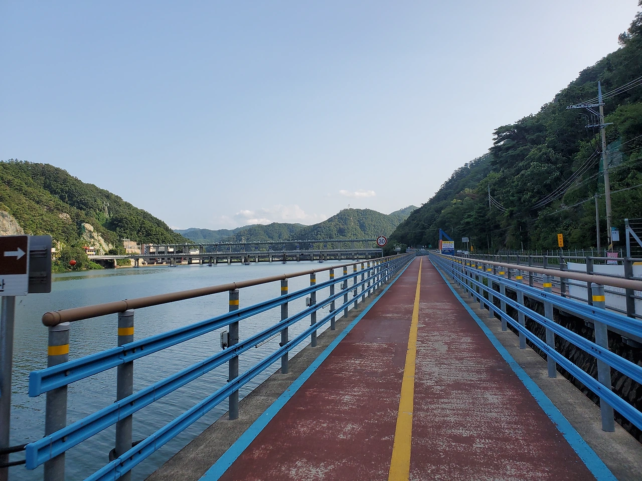 의암댐이 코 앞에 보인다. 의암댐까지 가면 이제부터 본격 약다운힐이다. 1% 단위로 나오는 게이지 화면엔 안 나오지만 모르긴 해도 05%~0.9% 정도 되는 다운힐일 가능성이 높다.