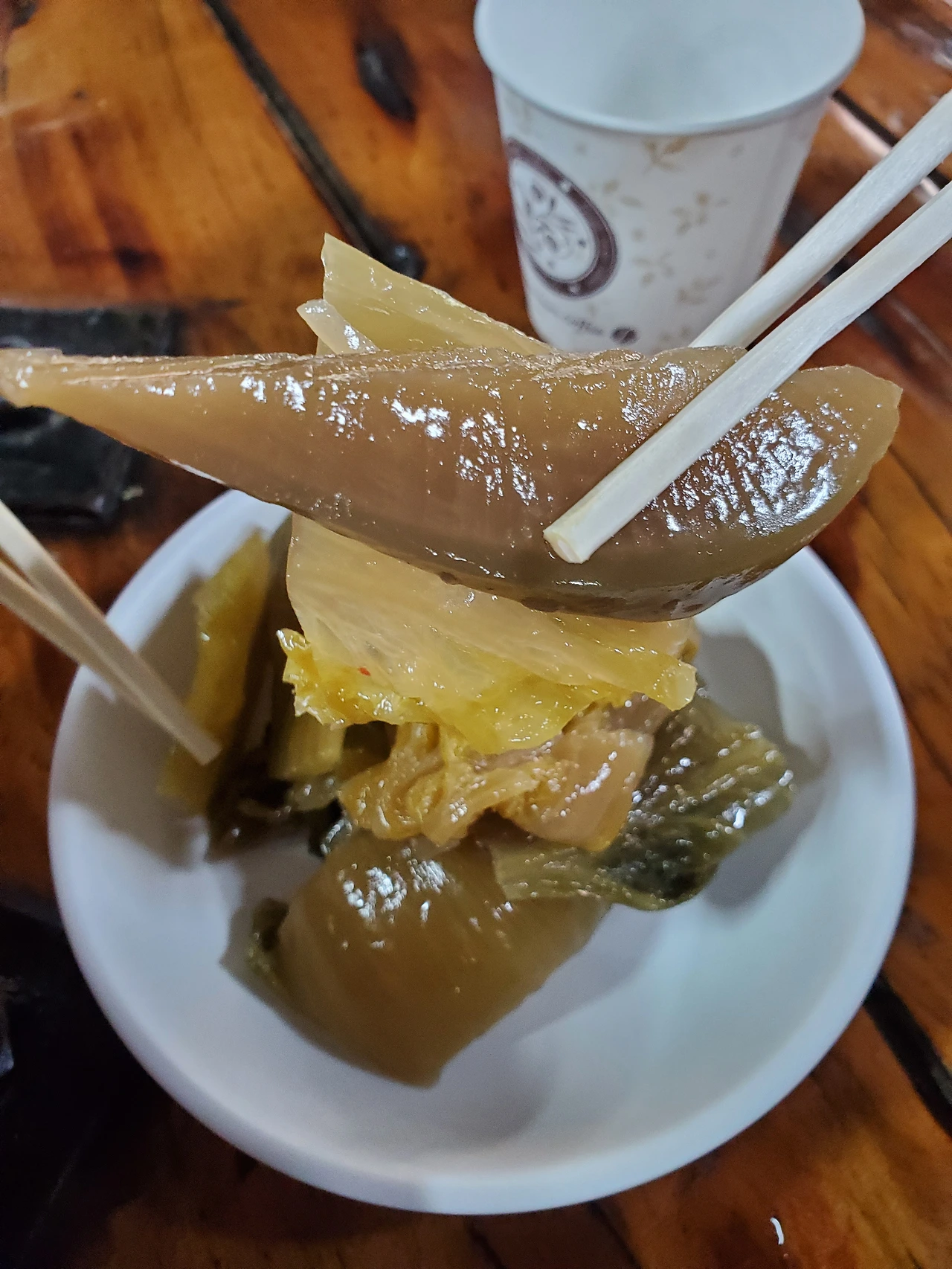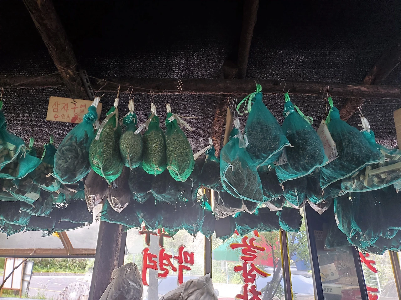 식당 천장엔 갖은 약재들이 건조되고 있었다. 삼지구엽초를 보니 94년도에 설악산 토왕폭 절벽에 매달려 삼지구엽초를 뜯어왔던 기억이 났다. 그 쓰디쓴 걸 몸에 좋다는 이유로 엄청 뜯어왔다가 이렇게 해도 쓰고 저렇게 해도 써서 몽땅 선물해버리고 말았다는... 나중에 알고 보니 엄청나게 비싼 약재였다. ㅠㅠ