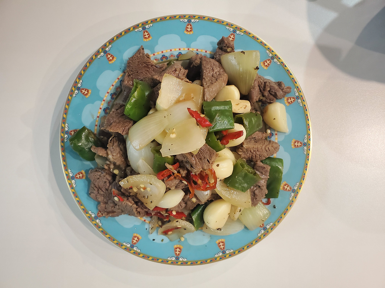 접시에 한우 볶음을 담아 사진을 남겼다. 역시 그릇이 예쁘면 음식도 맛깔나 보인다. 아직 간을 안 봤는데 짜진 않을까 싶었다. 평소 간을 안 보는 이놈의 고질병이 걱정된 거다. 그런데 의외로 간이 떡 맞고 청양고추 덕에 맛이 기똥찼다. 소 뒷걸음치다 쥐 잡는다더니... ㅎㅎ