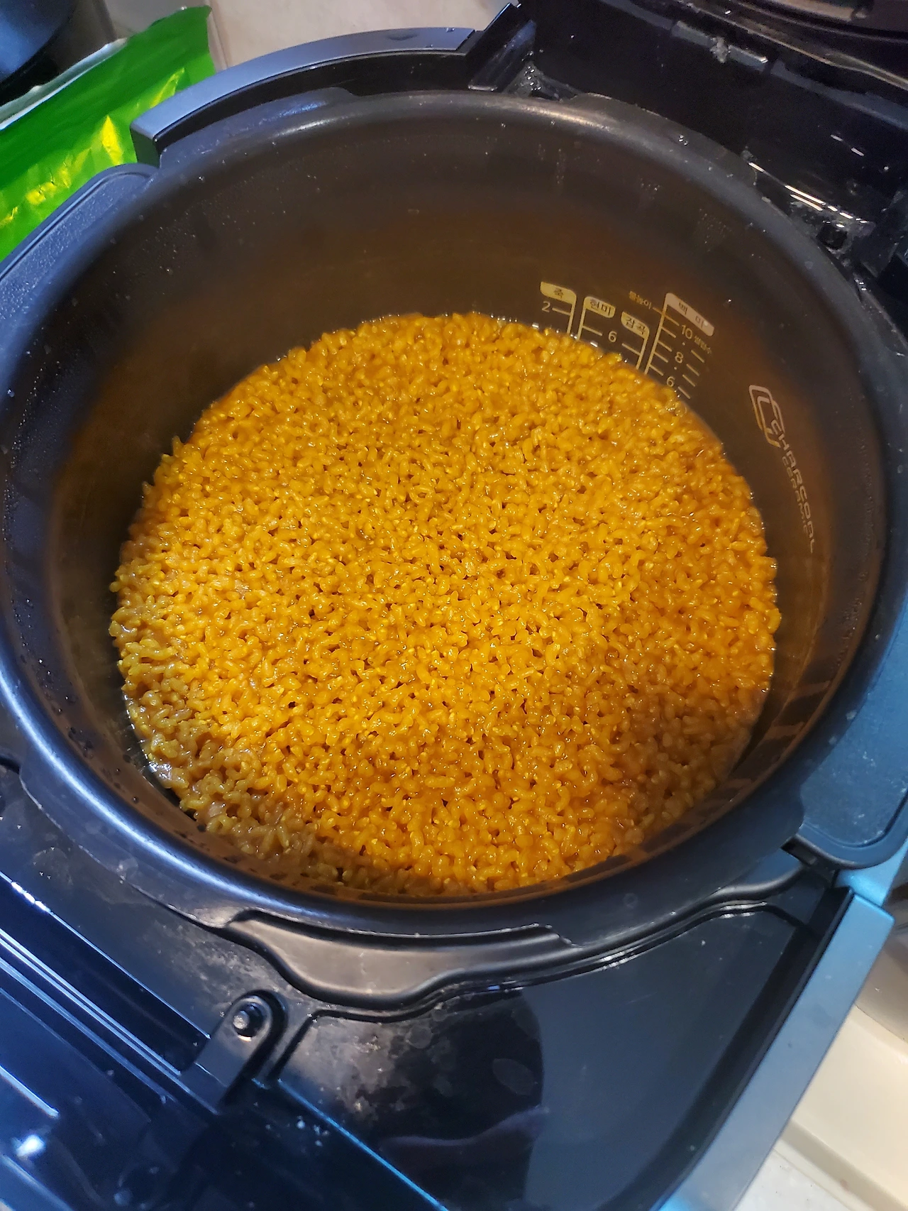 난 아침에 출근하자마자 현미쌀을 씻은 후 강황가루를 풀어 한 시간 정도 쌀을 불린 후 밥을 지었다.
