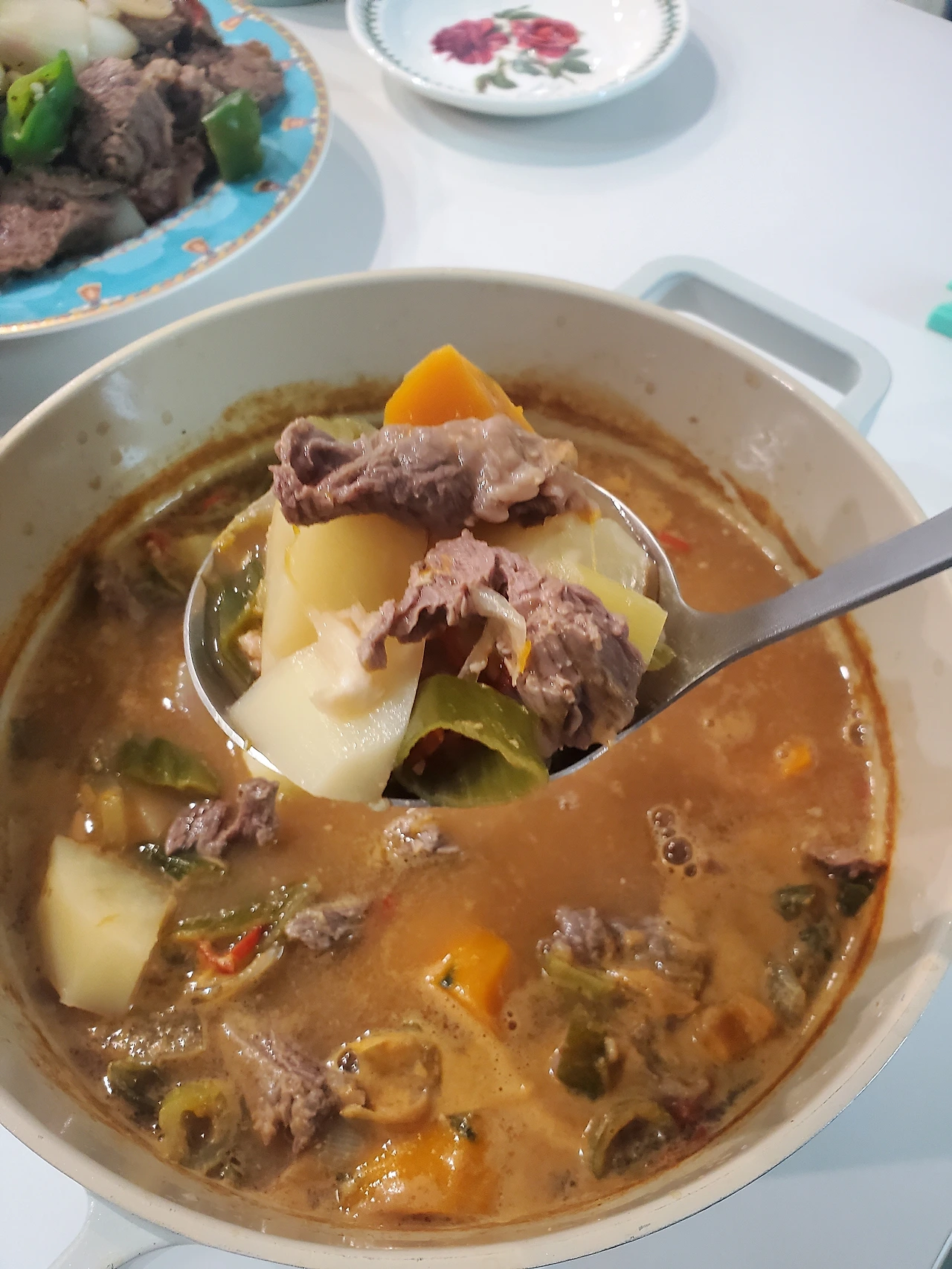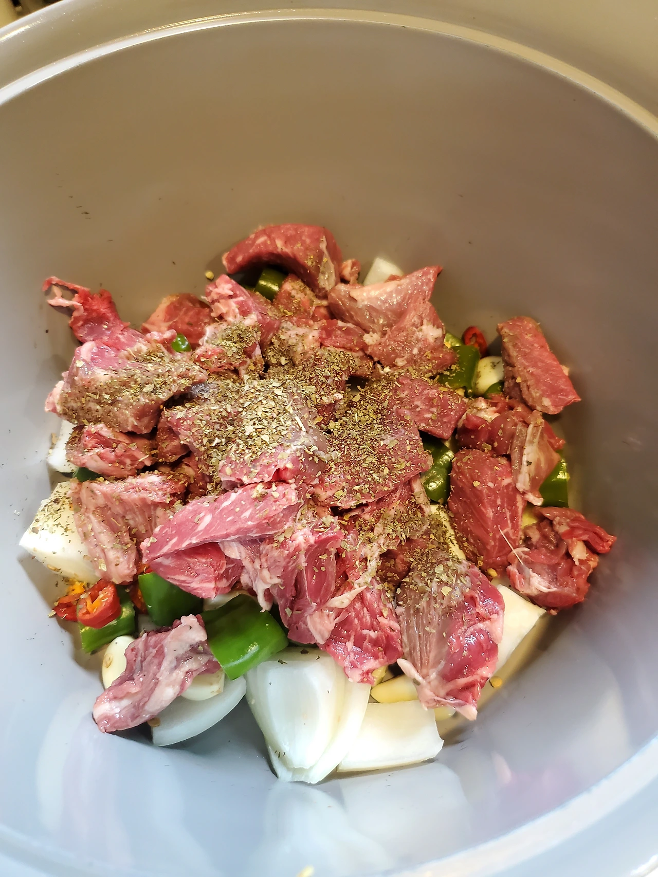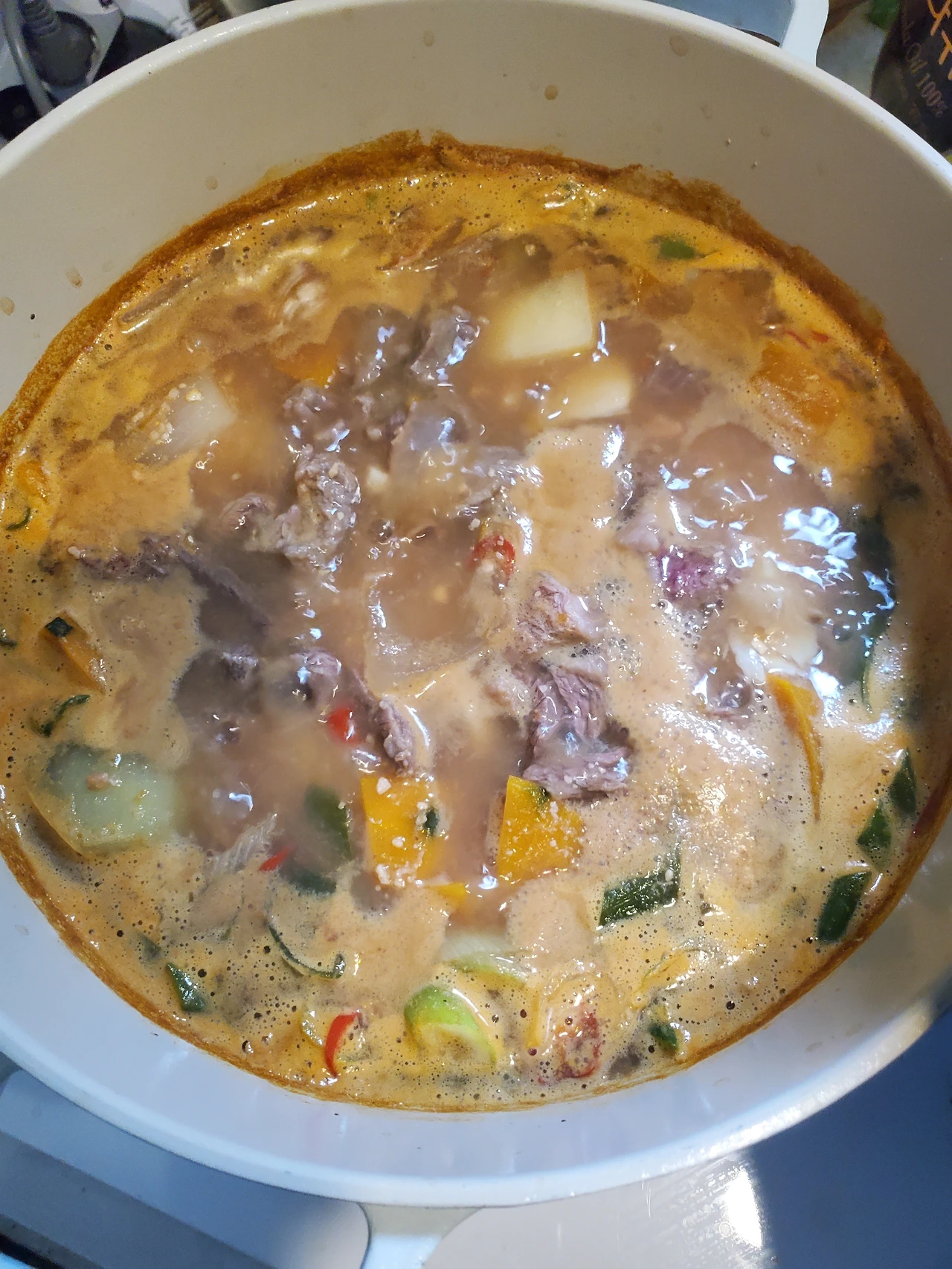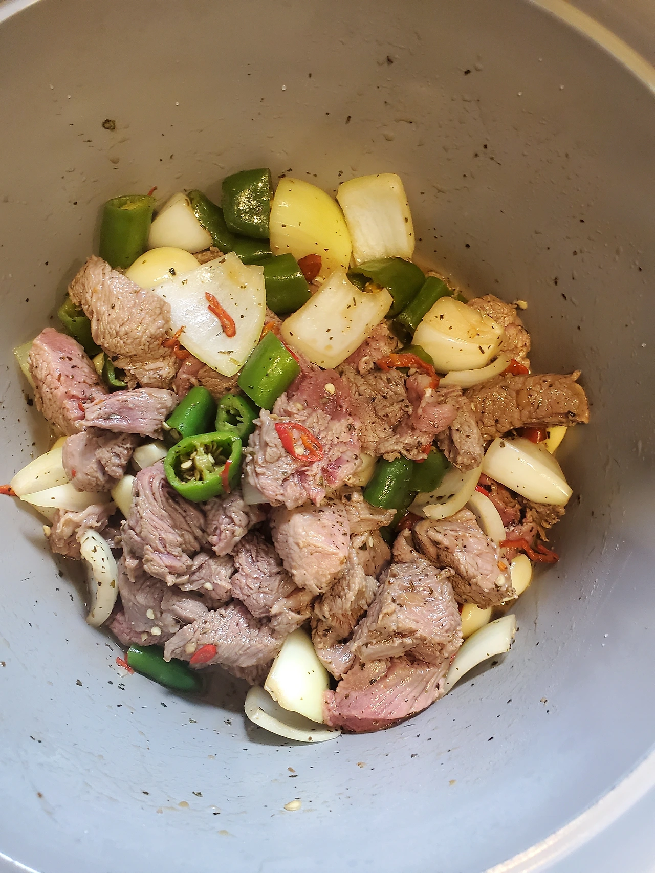 채끝등심에 붙어있던 기름을 다 걷어내고 먹기 좋은 사이즈로 깍둑썰기 하여 들통 사이즈 냄비에 투척했다. 미리 썰어둔 양파, 오이고추, 청양고추, 통마늘과 한우가 잘 어울려 주기를 바라며...