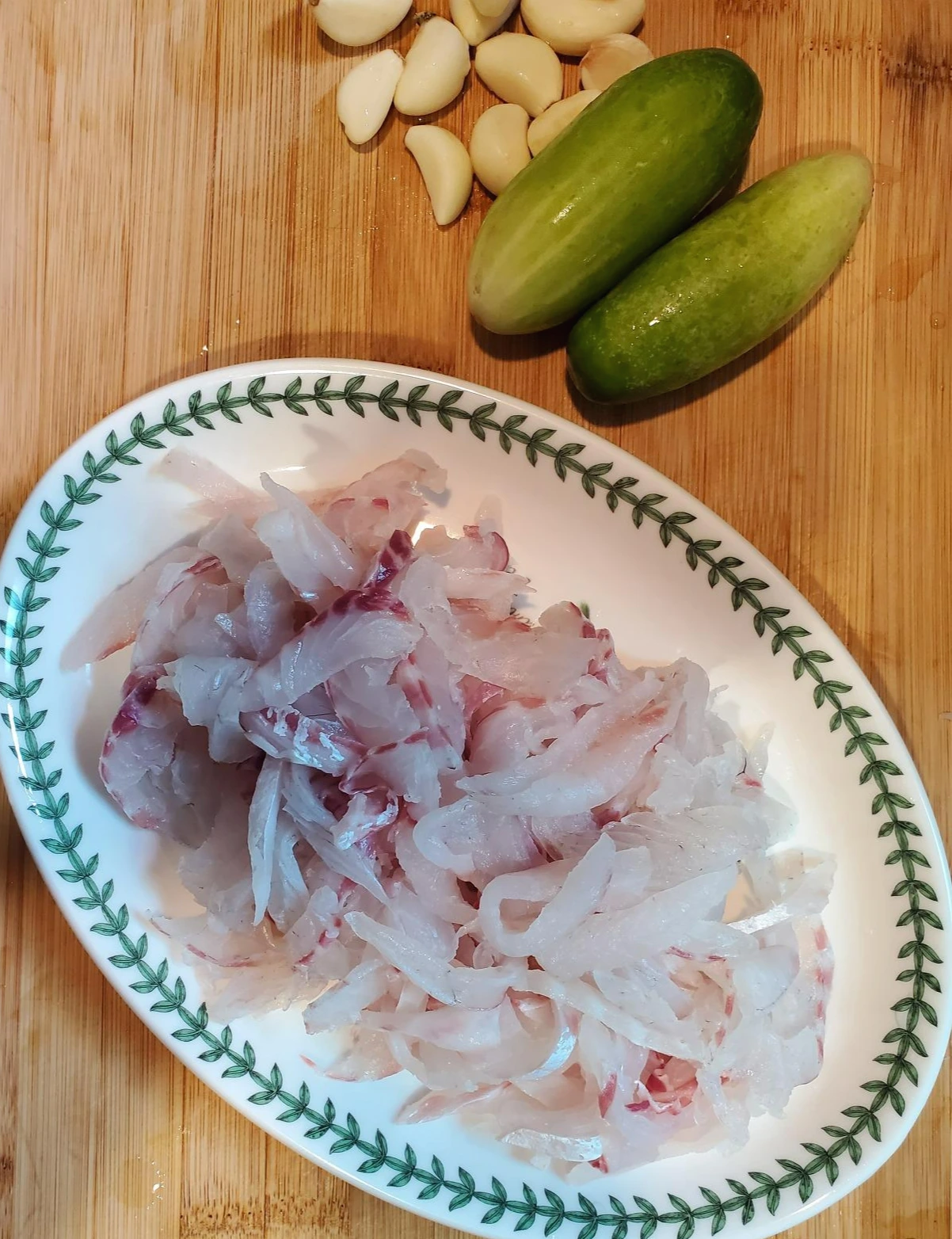 마침 사무실에 한 번도 사용한 적 없는 회칼이 존재하고 있었는데 아주 기가 막히게 칼이 드는 걸 확인하며 얇게 회를 떠서 접시에 가득 담았다. 회덮밥엔 빠질 수 없는 게 바로 오이와 마늘 아닌가? 냉장고에 남아있던 라오스 오이 2개를 잘게 자르고 단양마늘을 짓이겨 준비해 두고 제주에서 공수해 둔 상추를 먹기 좋은 사이즈로 잘랐다.
