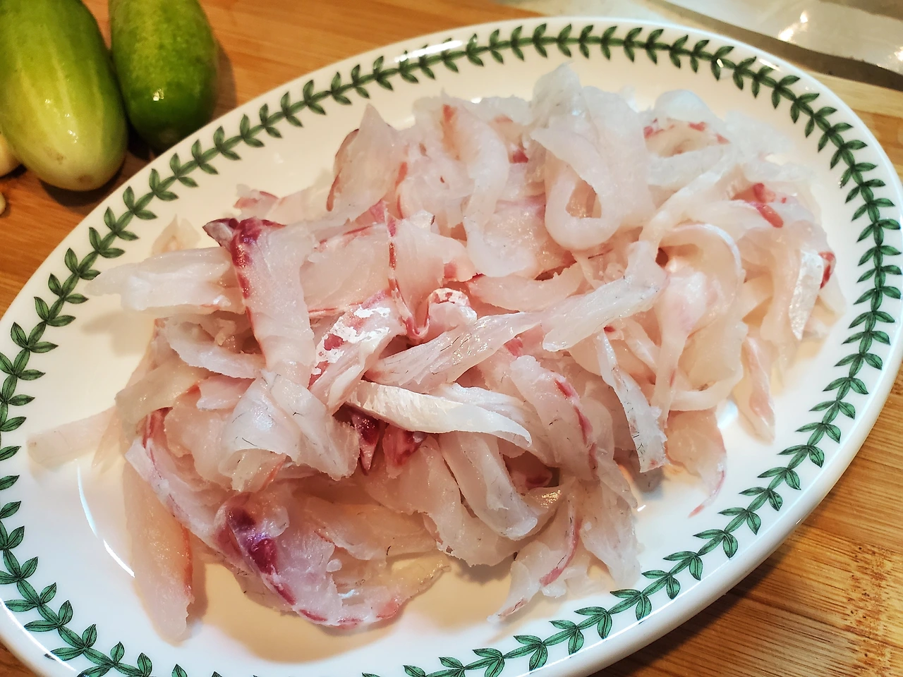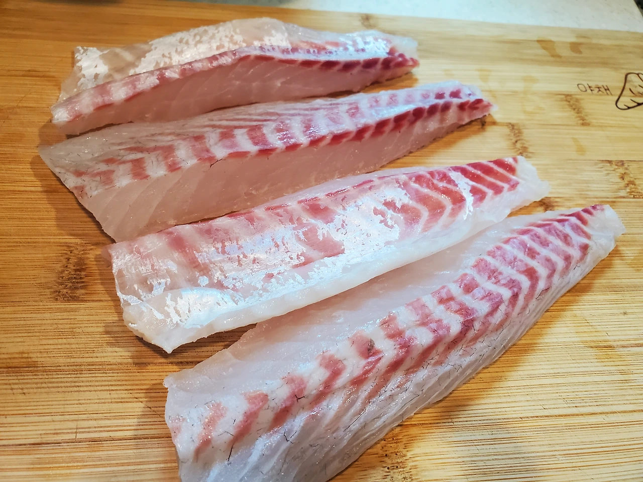 미팅을 마치고 손님 한 분이 급하게 가평으로 돌아가셔야 한다고 하셨는데 마침 낚시를 다녀왔다며 포를 떠 둔 회를 주고 가시겠다는 행복한 소식을 주셨다. 회 잘 뜨지 않느냐며... 오래 알고 지낸 분이라 나에 대해 너무 잘 아시는 분이다. 아무튼 이게 웬 떡인가? 원래 계획했던 열무비빔밥은 급선회하여 회덮밥으로 변경된 것이다. 돌아가신다는 손님을 따라 차 트렁크 아이스박스에 곤히 실려 있던 회 두 덩이를 얻어 들었다. 한 덩이는 참돔, 한 덩이는 얼음돔이었다. 양이 너무 많아 두 녀석을 두고 잠시 선택의 고민에 빠졌는데 결국 참돔에 손이 가고 말았다. 아무래도 익숙한 참돔이 훨씬 나을 거란 생각이었다.