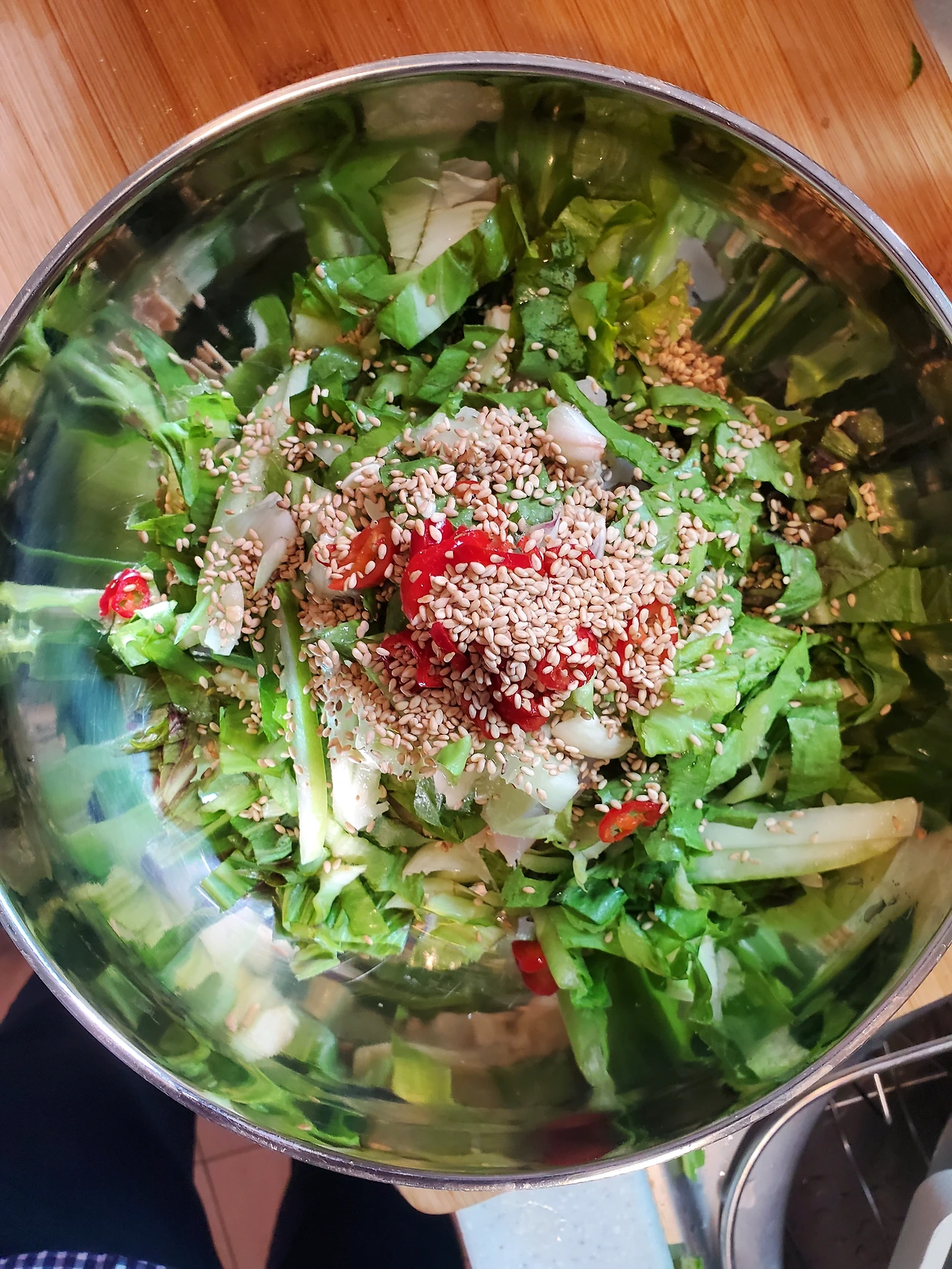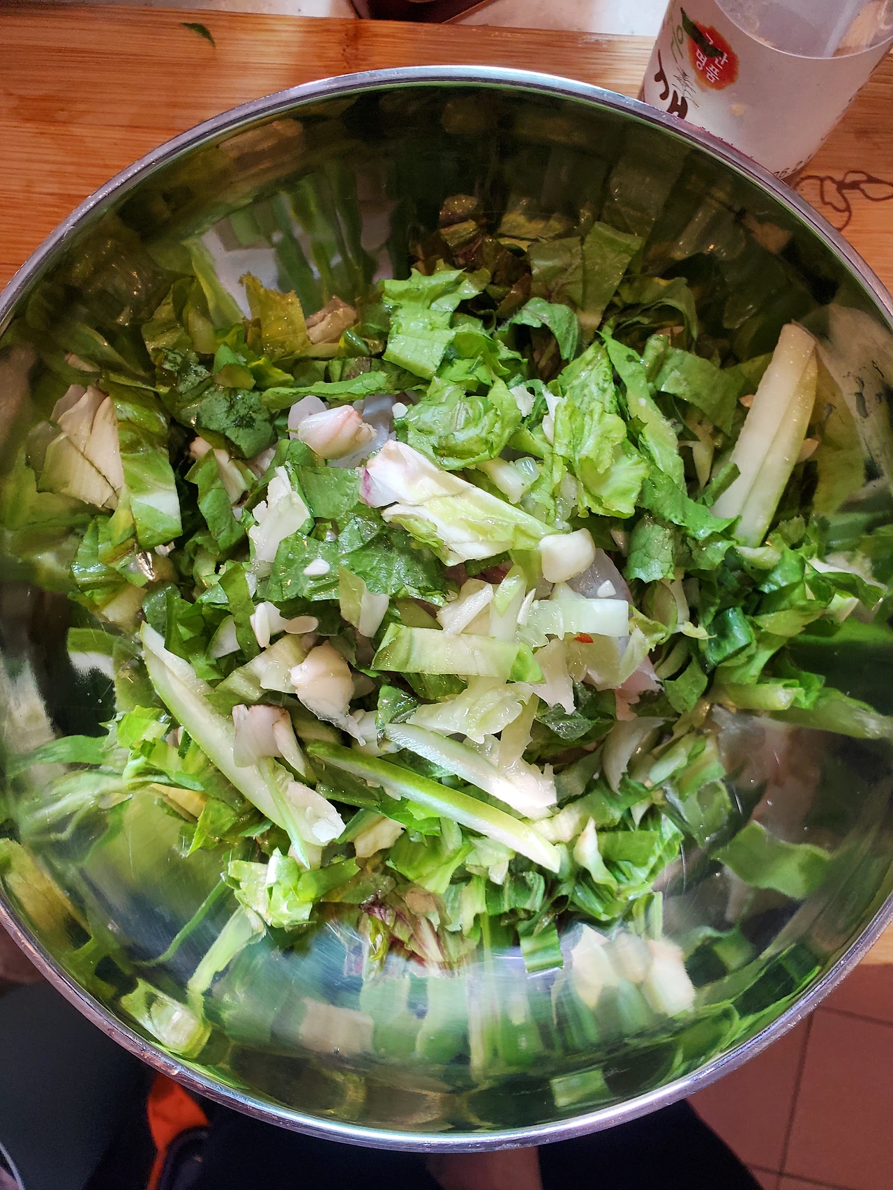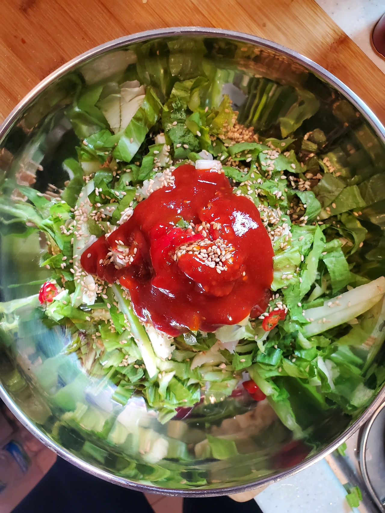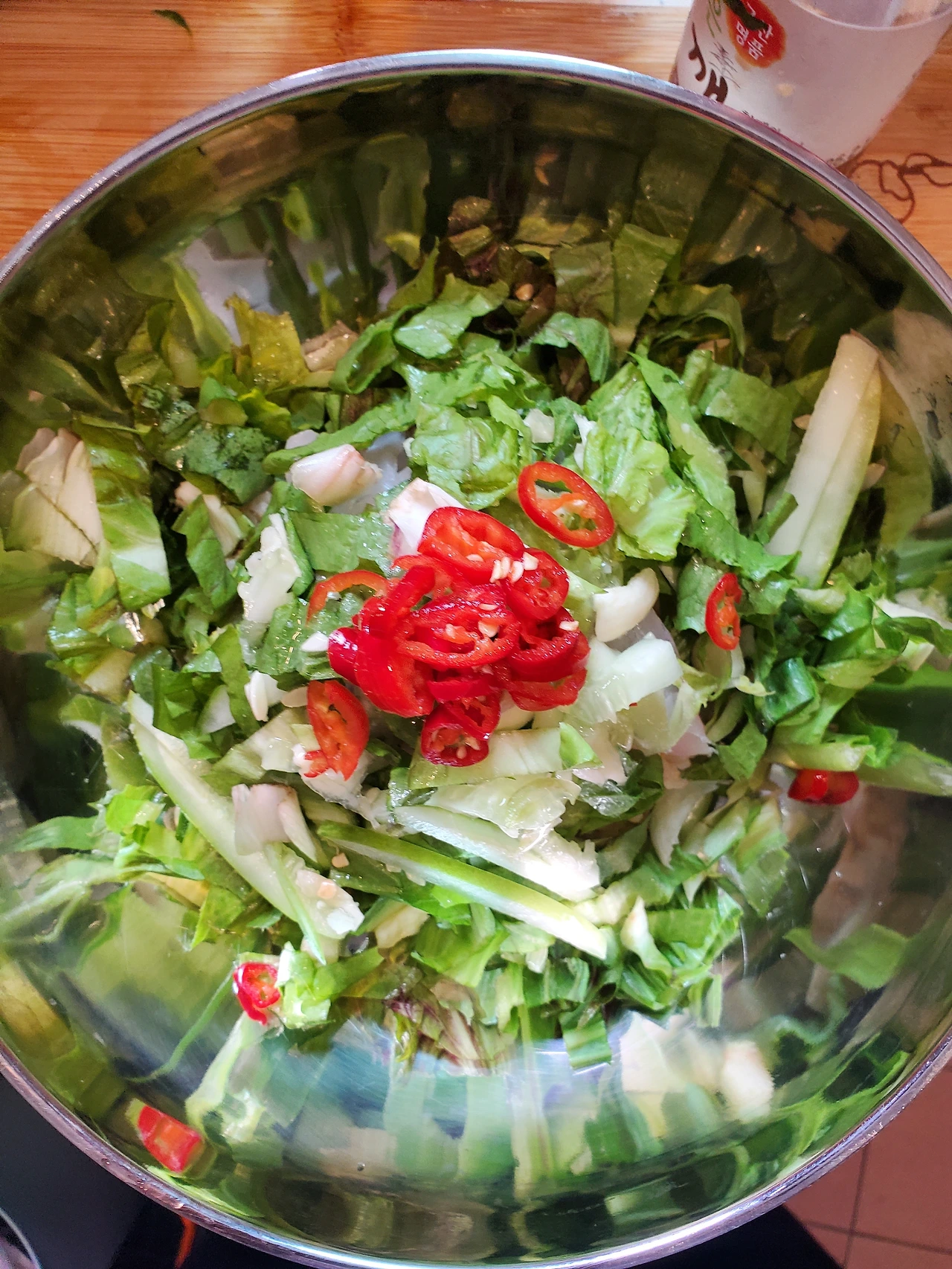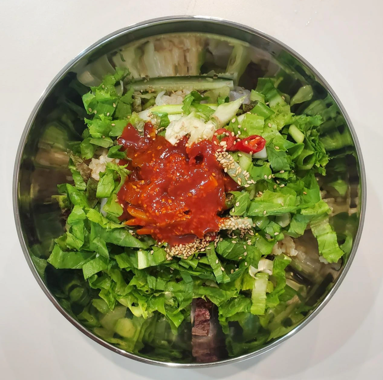 그 위에 상추, 다진 마늘, 오이를 담뿍 넣었다.