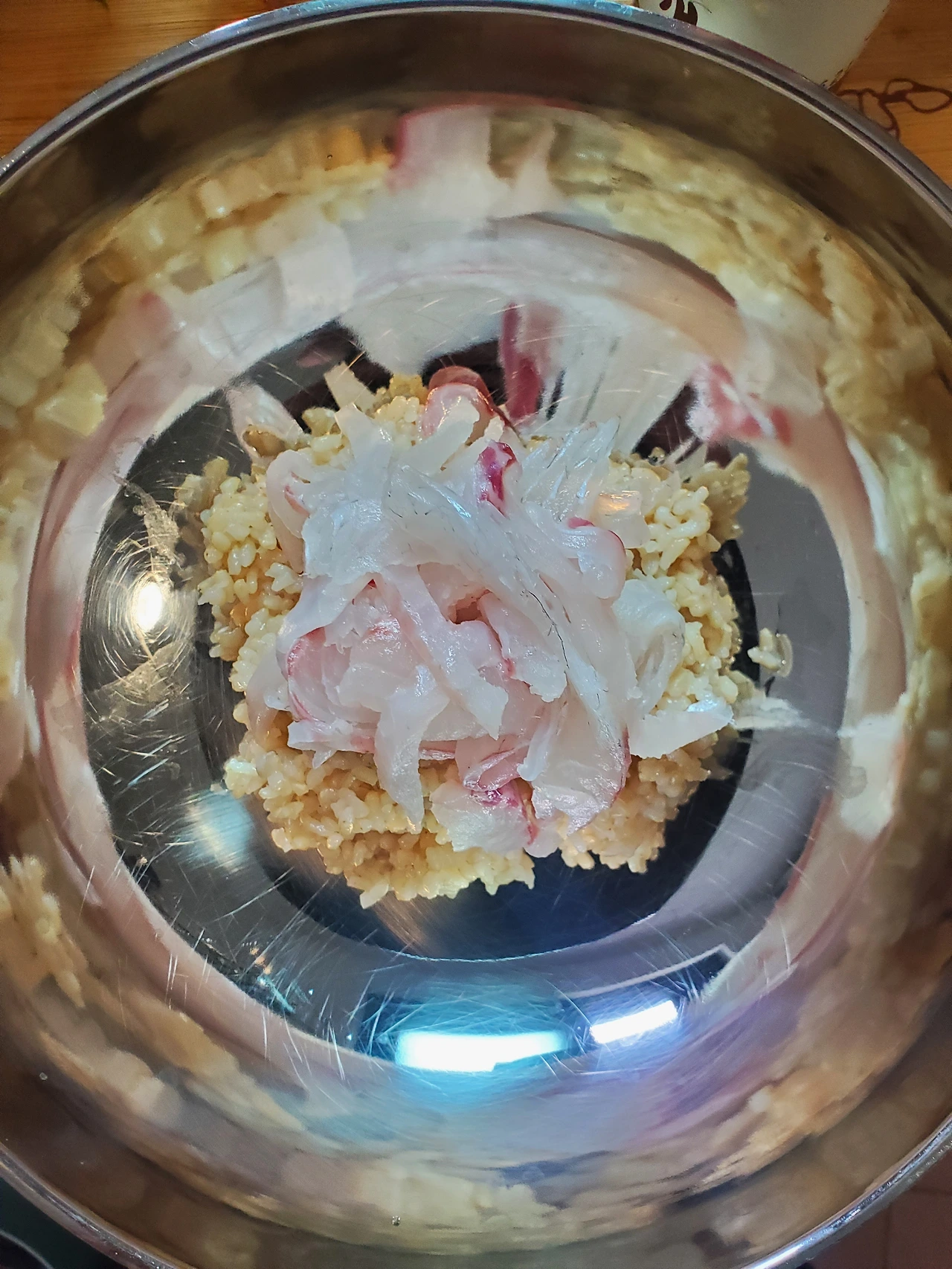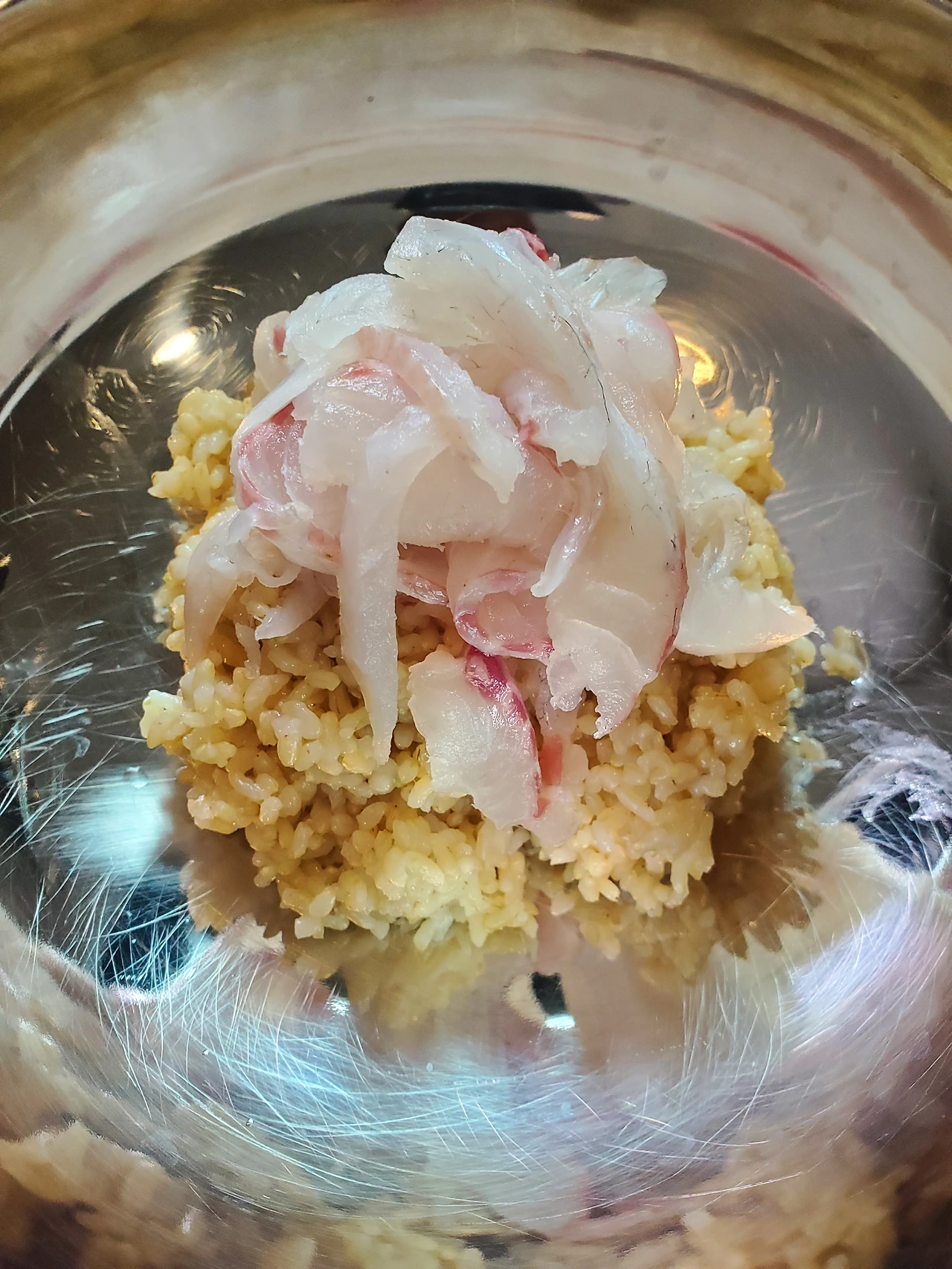 현미밥 위에 적당량의 참돔을 얹은 후 사진을 촬영했다. 참돔을 자르느라 손에 온통 기름이어서 세제로 손을 닦아야만 했다. 냉면 그릇이라 아쉽지만 어쩌겠나? 집도 아닌데 그릇을 쟁여둘 수도 없는 노릇이고.
