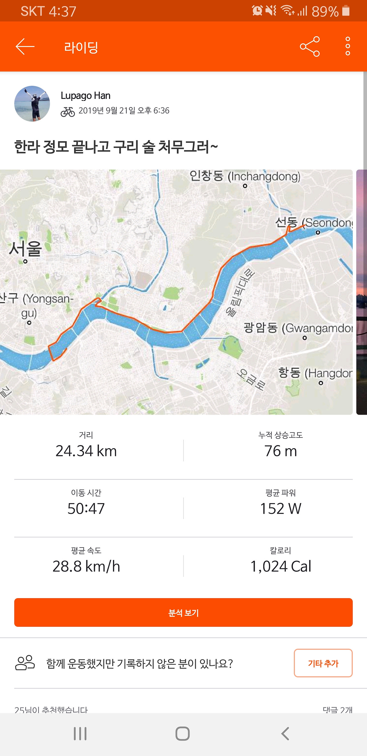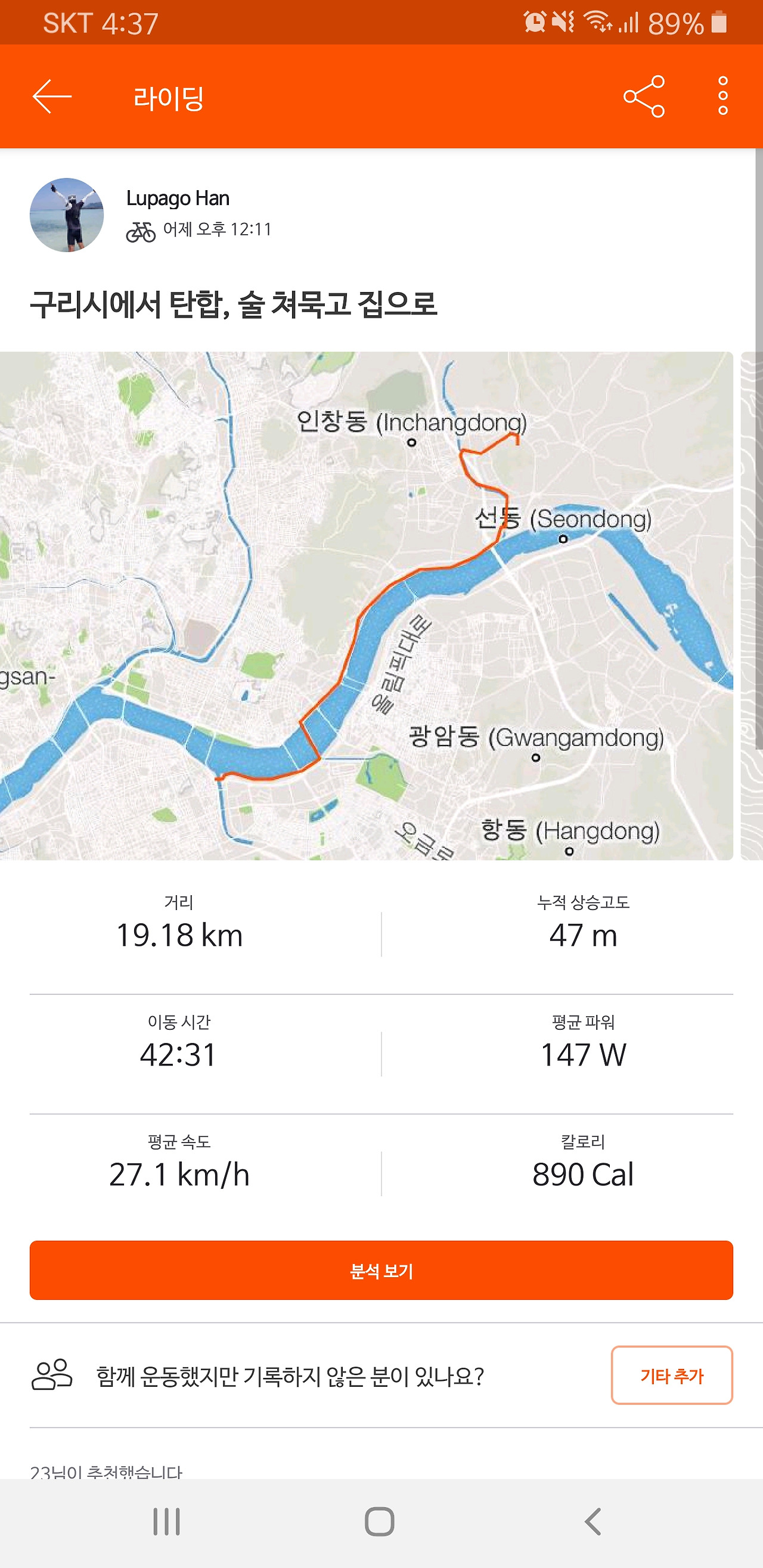 좀 더 운동 삼아 달렸다면 KOM도 찍어볼 수 있는 좋은 기회였을 거다.