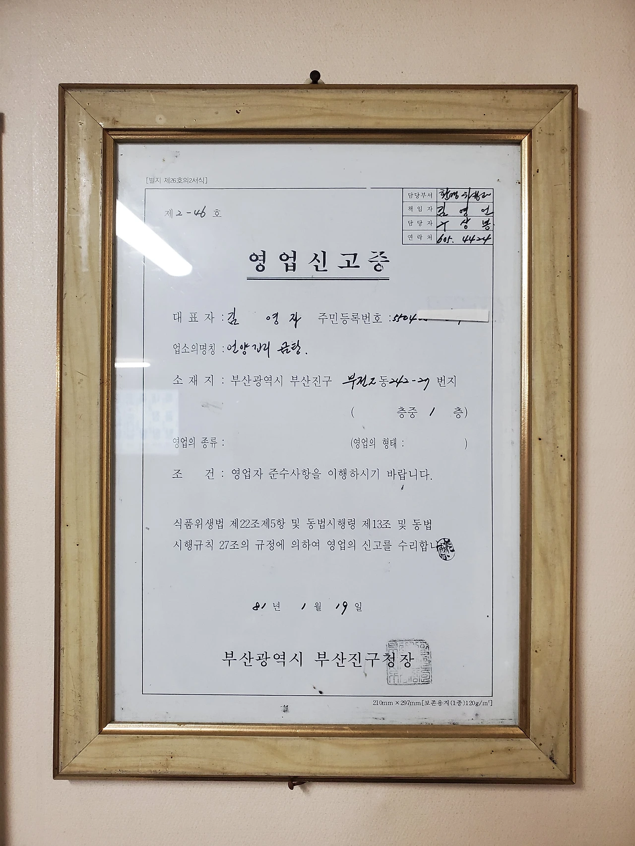 프런트 앞에 영업신고증이 있어 사진을 촬영했다.