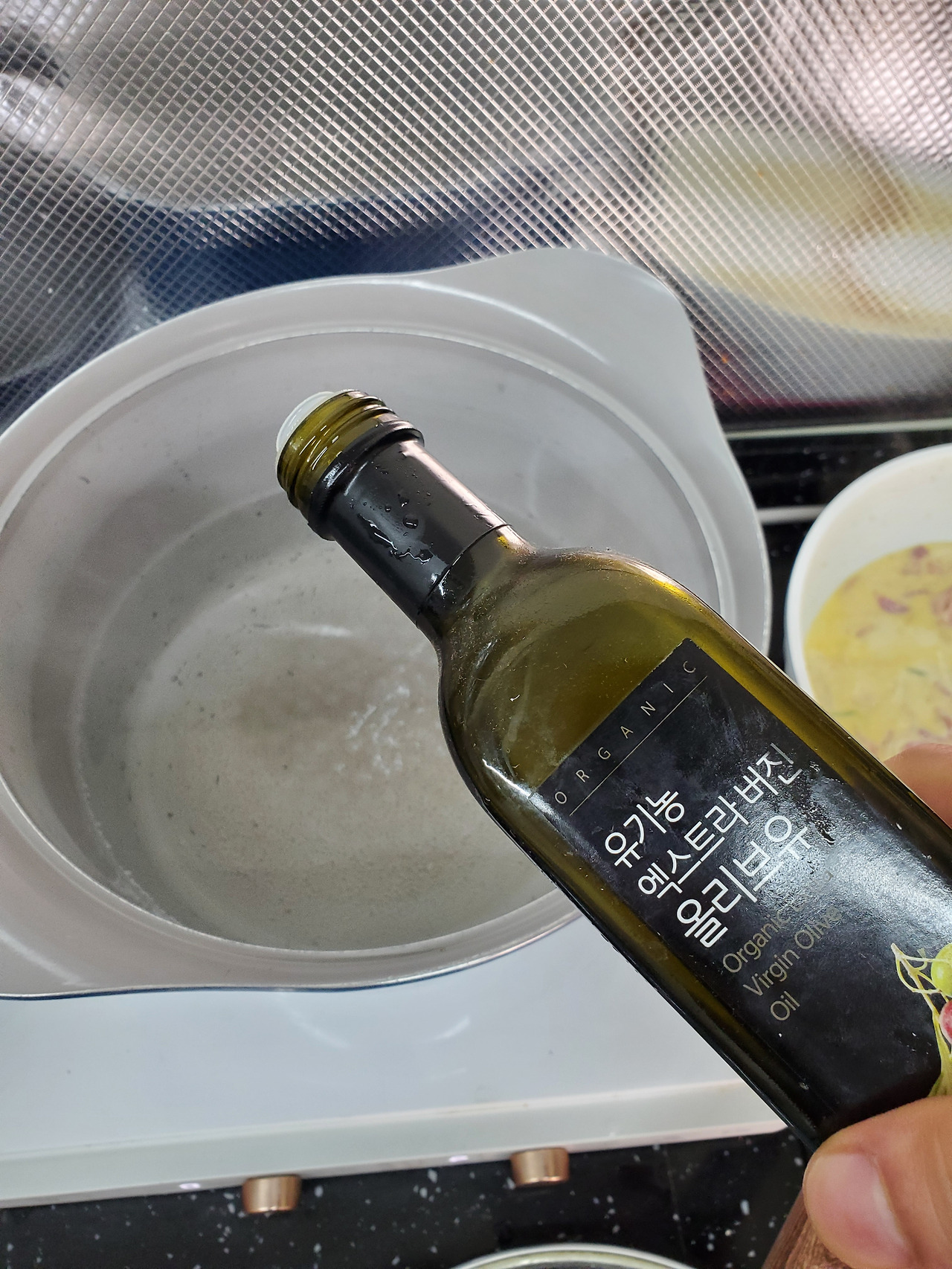 솥에 물을 끓이면서 올리브유 몇 방울 떨궜다. 이건 어디서 주워들은 바가 있어서.