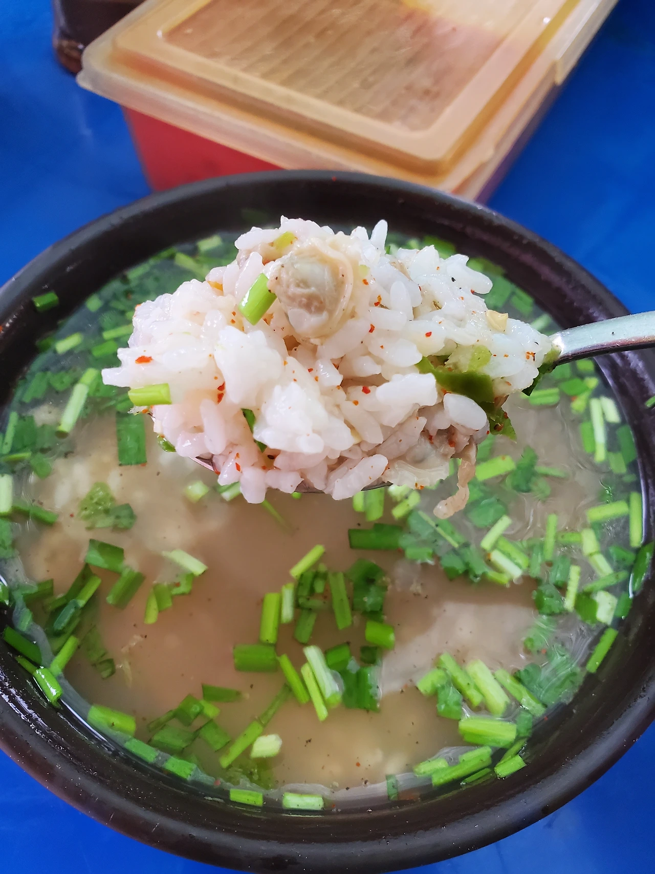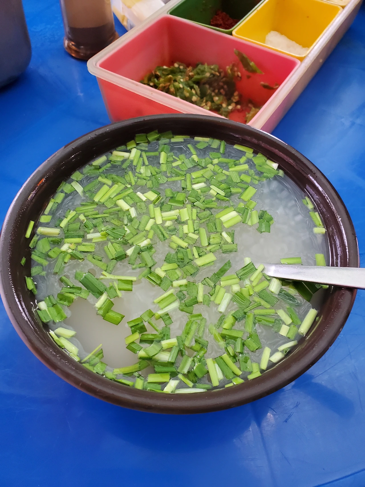 이 식당은 아침에만 한다. 어디가 건물인가 싶은데 건물은 없다. 이렇게 천막을 치고 영업하는데 메뉴도 딱 세 가지뿐이다. 별로 대수로울 것 없어 보이는데 맛은 일품이다. 난 여기서 재첩국만 먹어봤다. 시락국밥과 선지국밥이 있는데 부산하면 재첩국 아닌가?