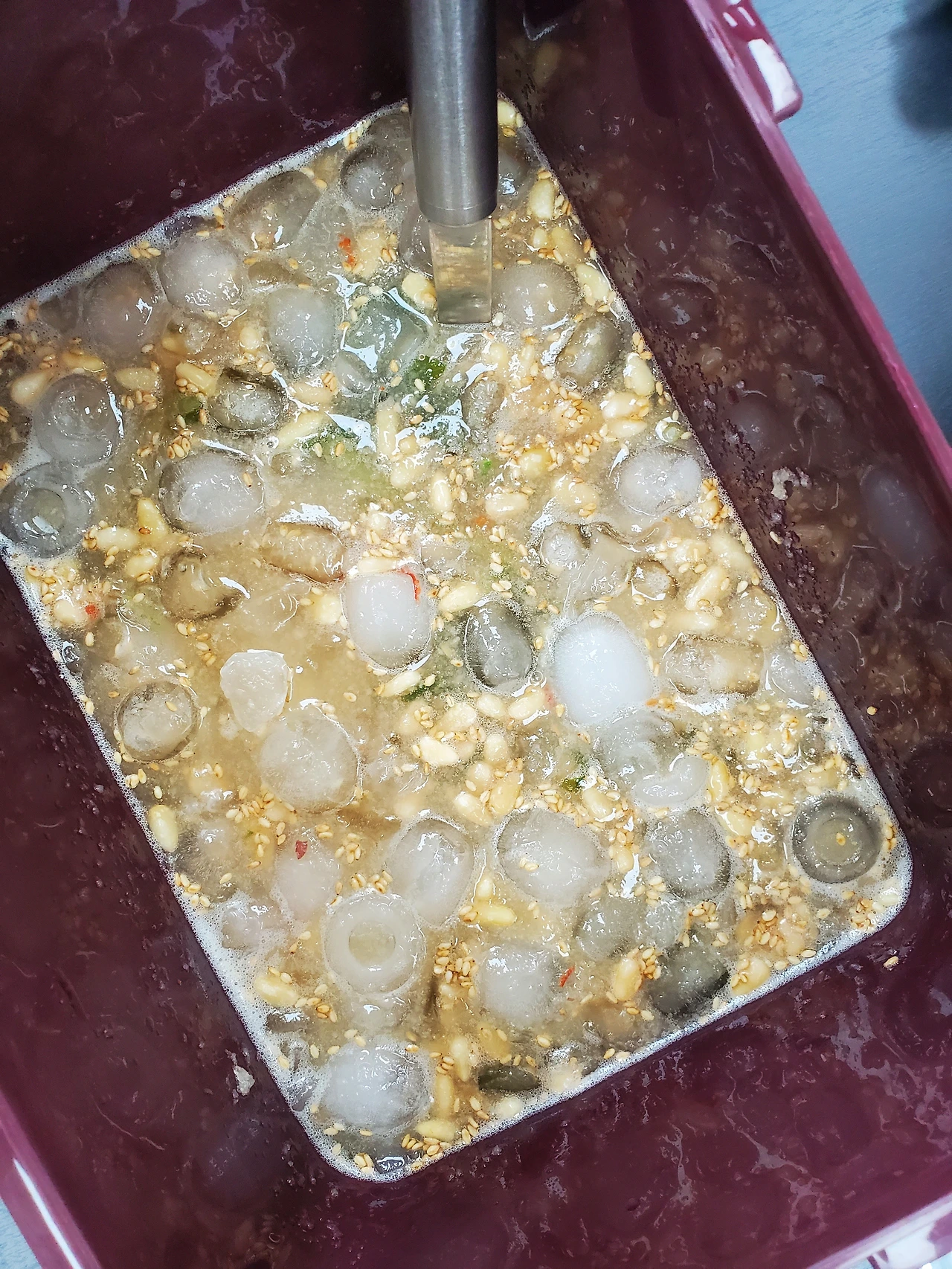마지막으로 얼음을 몽땅 때려 넣고 휘위휘이 저어준다. 그럼 육수는 준비 끝!