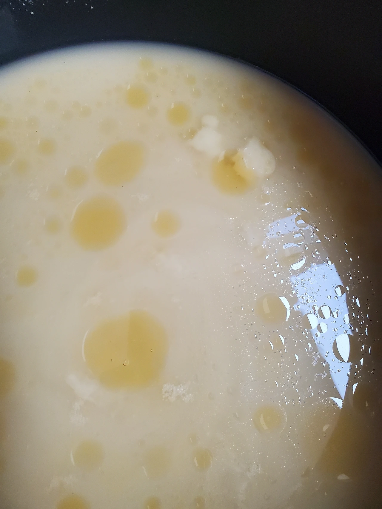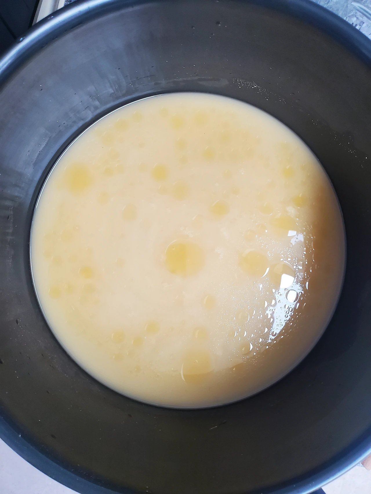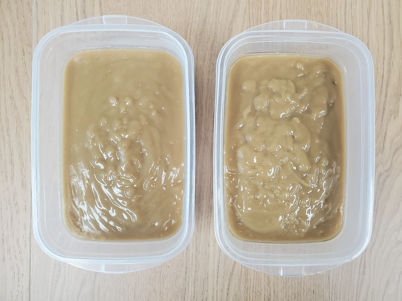 문제가 생겼다. 담을 용기가 보이지 않아 싱크대를 뒤져 이런 플라스틱 용기 두 개를 찾아냈다. 우선 용기 안쪽에 참기름을 바른다. 그렇지 않으면 뒤집었을 때 묵이 잘 떨어지지 않는다. 그리고 사진으로는 제대로 안 나왔는데 용기가 너무 작아서 묵이 꽤 두껍다.