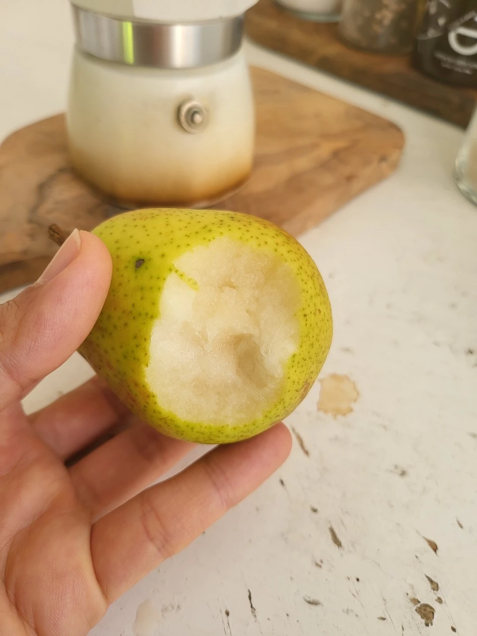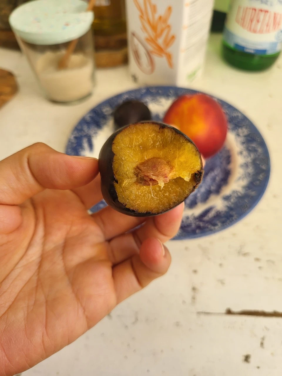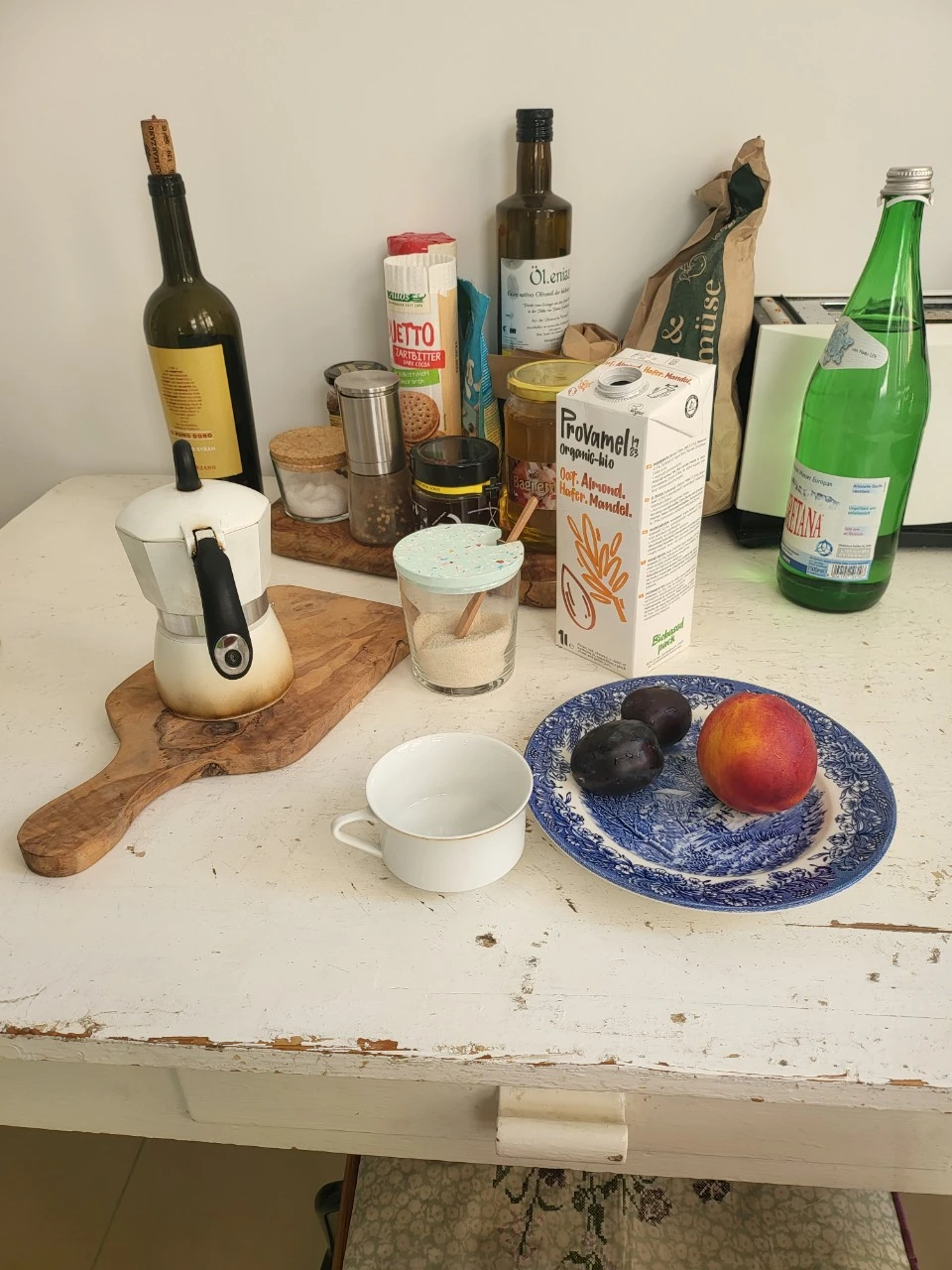 알렉산더와 디애나가 서프로에게 아침식사를 같이 하자고 했는지 독일 가정식 아침식사를 준비하는 동안 주방을 기웃거린 모양이다. 푸룬(자두)과 독일 배를 먹고 또 독일어로 쓰인 뭔가를...