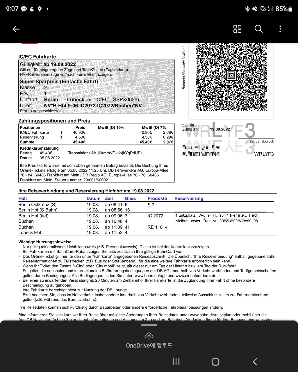 베를린에서 뤼벡으로 가는 열차표다. 가격은 SRT와 비슷한 수준이다. 참고로 지하철은 한국보다 비싼 편이라고 하며, 이번에 서프로는 1만 원에 한 달 티켓을 구해서 저렴하게 다녔다. 서프로가 탄 열차는 고속철이라고 한다. 완전 파격적인 거라고 한다.