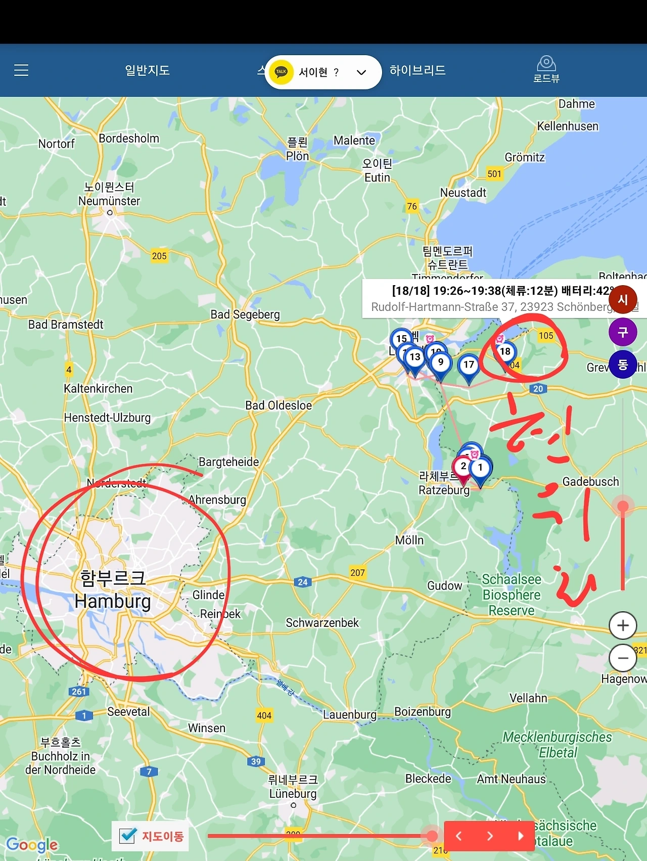 함부르크 공항에 간다는 사람이 영 반대 방향으로 가고 있는 거다. 이상하다 싶어서 재차 목적지를 물었고 상황을 파악하니 열차를 거꾸로 탄 게 분명했다. 확인해 보라고 연락을 했고 난 그래도 큰 역에서 내리라고 하려는데 카톡 메시지가 수신됐다.