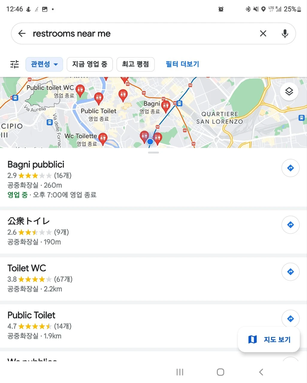 아무튼 구글 맵에 내 주변 화장실이라고 검색하면 친절하게 알려준다.