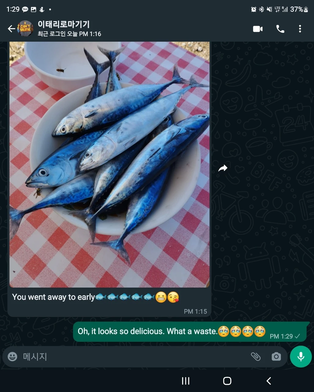 지지와 루미나가 메시지를 보내왔다고. 벌써 'I miss U'를 외치는 것만 같다. 오른쪽 생선은 고등어 같다. 누가 또 갖다 줬다고 한다. 이거 요리할 건데 돌아와~ 이런 느낌일까?