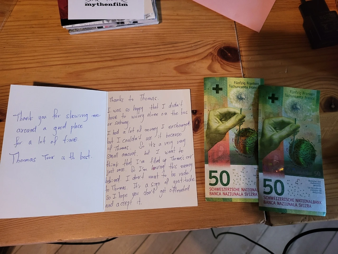 옆의 지폐는 토마스가 서프로를 케어한다고 여기저기 장거리를 다니며 지출한 유류비만 해도 미안한 감정이 드는데 이렇게 하는 건 실례가 아닌가 싶어 나에게 의견을 물었다.