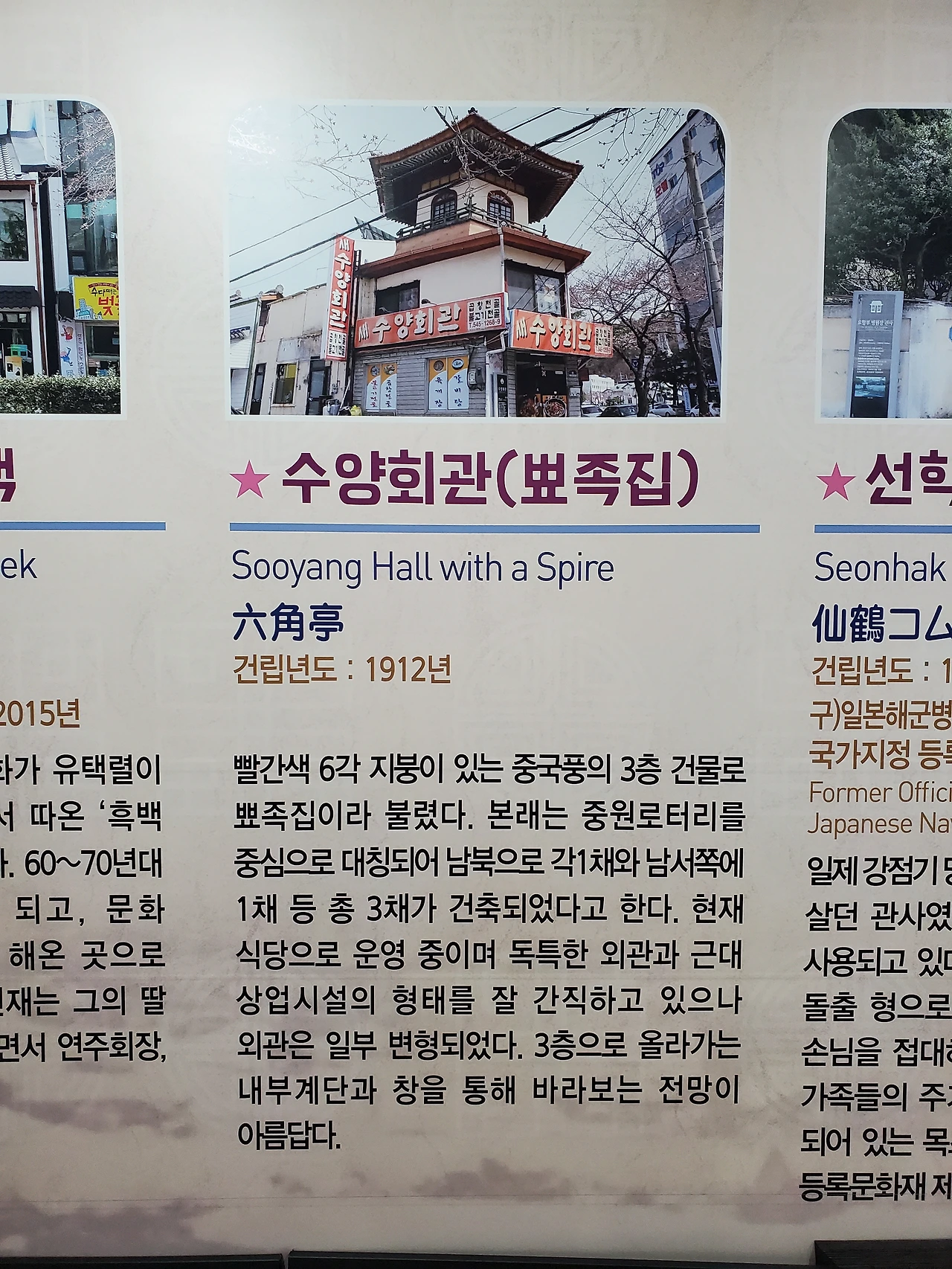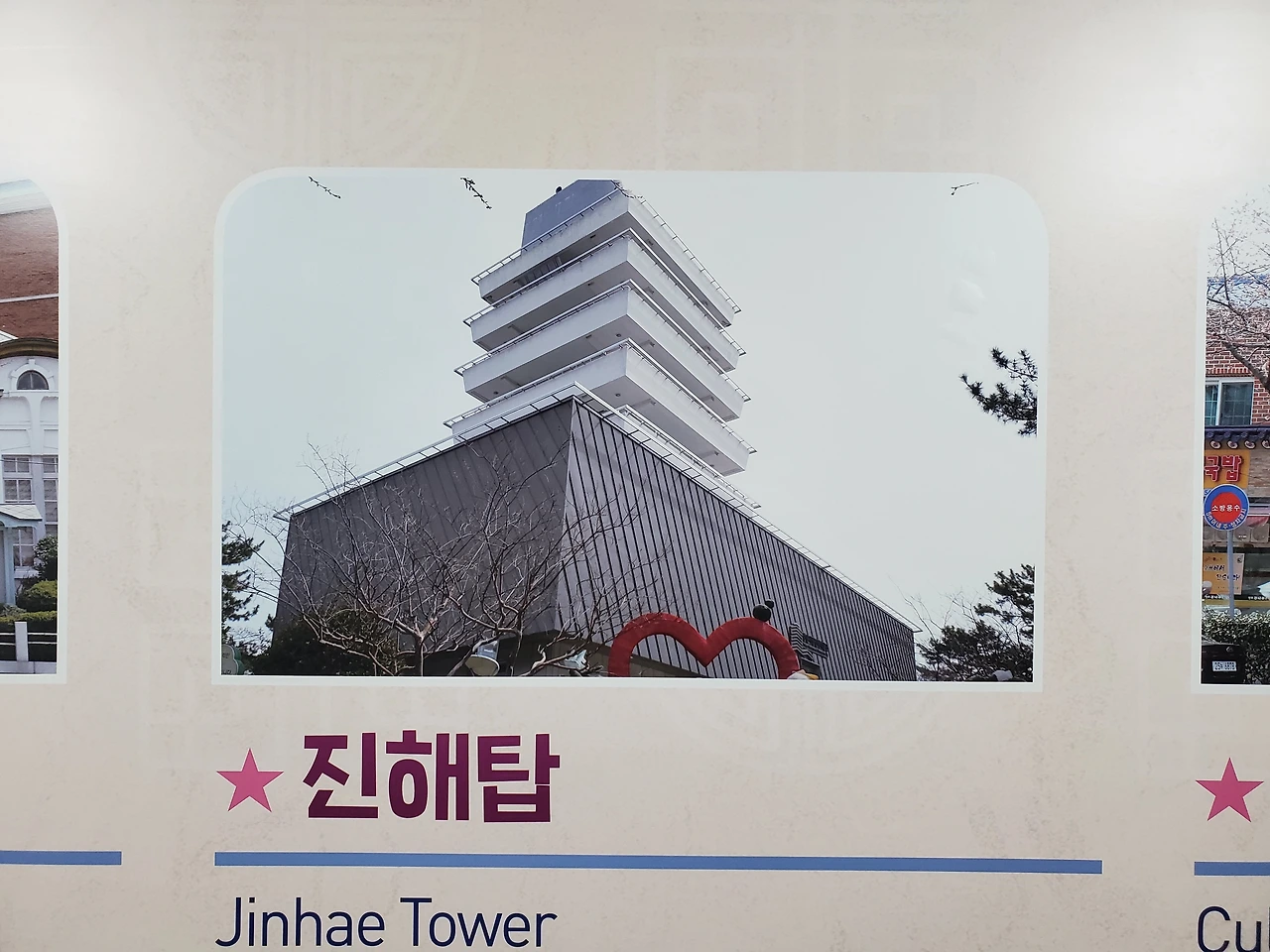 다양한 진해의 명소들이 있는데 낸 눈에 띄는 게 이것들이다. 아까 본 건물도 있다. 나중에 길을 걷다가 뾰족집이라는 육각정 수양회관도 만났는데 이른 시간이라 영업은 하지 않고 있었다. 진해탑은 어릴 때 엄마 손을 잡고 올라갔던 기억이 있다. 시간이 부족해 올라가 보지는 못했지만 말이다. 다음에 진해 가면 꼭 올라가 보리라고...