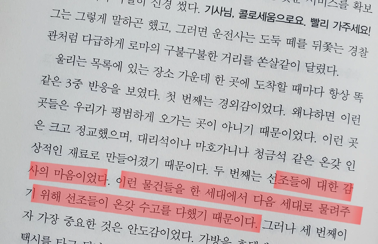 이 글을 쓴 다음 날 아침 평소처럼 삼십 분 독서를 하는데 이 문구를 발견했다. 그들은 에이모 토울스의 <링컨 하이웨이> 속 울리가 콜로세움 같은 명소 위에 서서 느낀 생각을 표현했다. 아마 이 글이 쓰여진 것은 작가인 에이모 토울스가 세계 여행을 하며 느낀 바를 울리의 시각을 통해 옮겨본 게 아닐까 싶다.