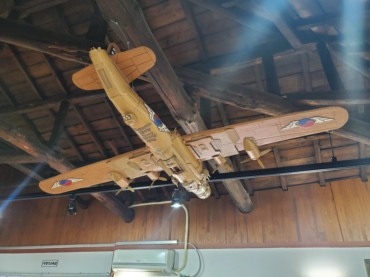 천정에는 종이박스를 이용해 만든 4엽 폭격기가 걸려 있다. 꽤 잘 만들었다.
