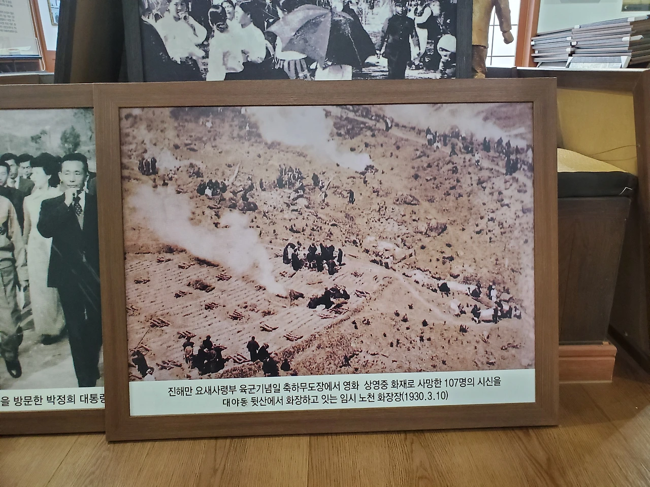시니어 할아버지의 설명... 영사기에서 불이 붙어 기름 덩어리 천막에 불이 붙어 유해가스를 마신 아이들 107명이 사망한 사건이 있었다고... 사진에 보이는 건 대야동 뒷산에서 단체 화장을 하는 모습이라고 한다. 1930년 3월 10일이라고 하니 벌써 92년이나 지난 일이다.
