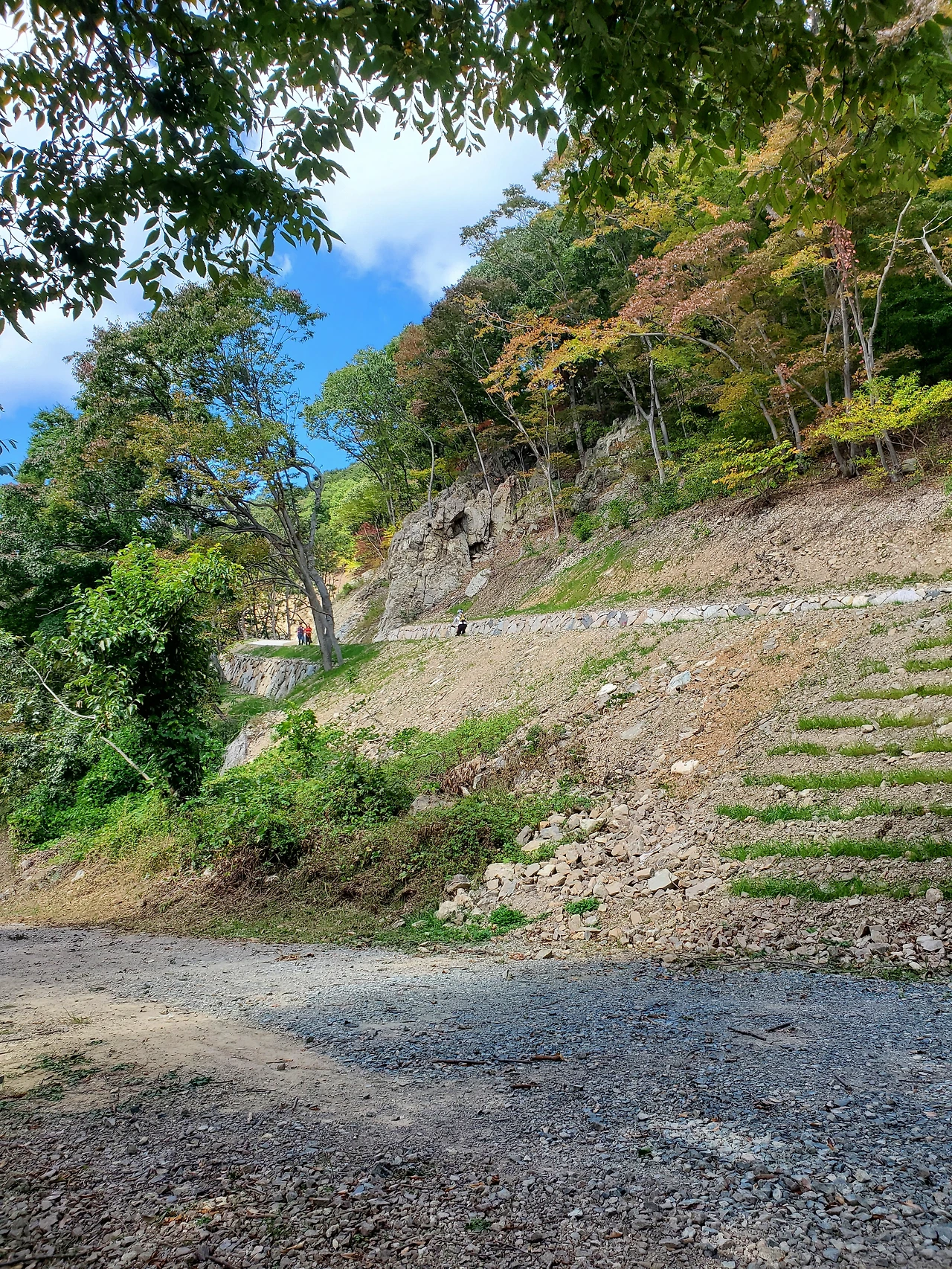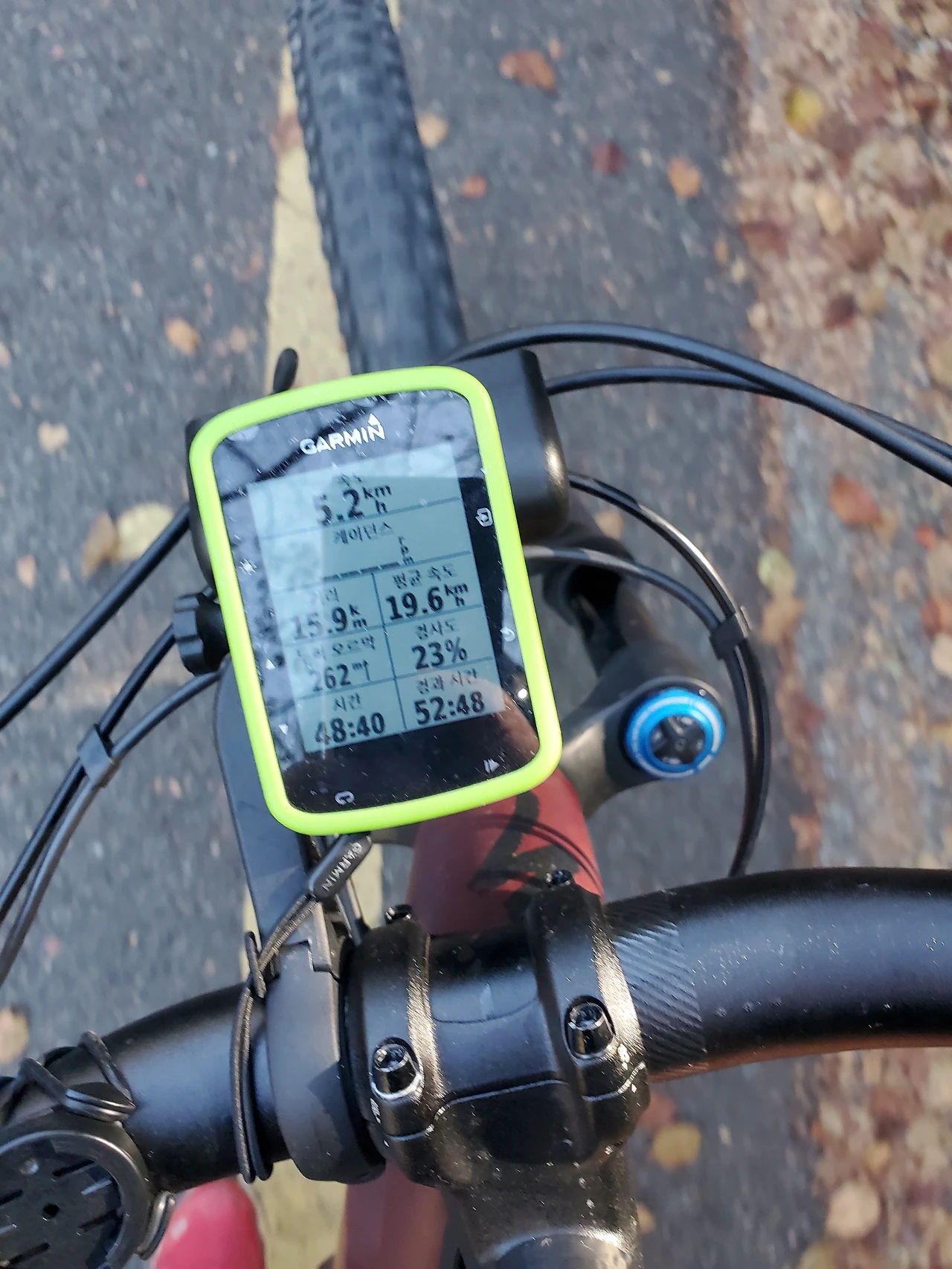 오른쪽 산은 450m 높이의 개좌산이라고 한다. 그런데 의외로 마지막 업힐이 나를 놀라게 했다. 최고 경사도는 24%까지 가파르게 일어섰다. 만약 로드바이크 타고 왔다면 허벅지 터지는 맛을 봐야 했을 거다. 나는 살며시 trail 모드로 변경하고 말았다. 벌써부터 허벅지에 트러블이 생기면 안 된다. 이제 겨우 16km 정도 달려왔고 앞으로 약 100km 정도 더 달려야 하기 때문이다. 배터리는 기껏 100km 정도 달리면 아웃이고, 앞으로 어떤 경사도의 어떤 코스가 나타날지 알 수 없으니...