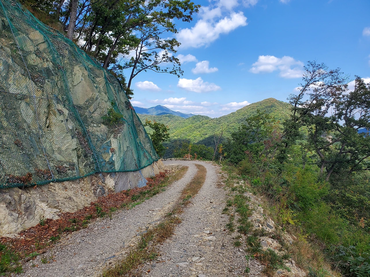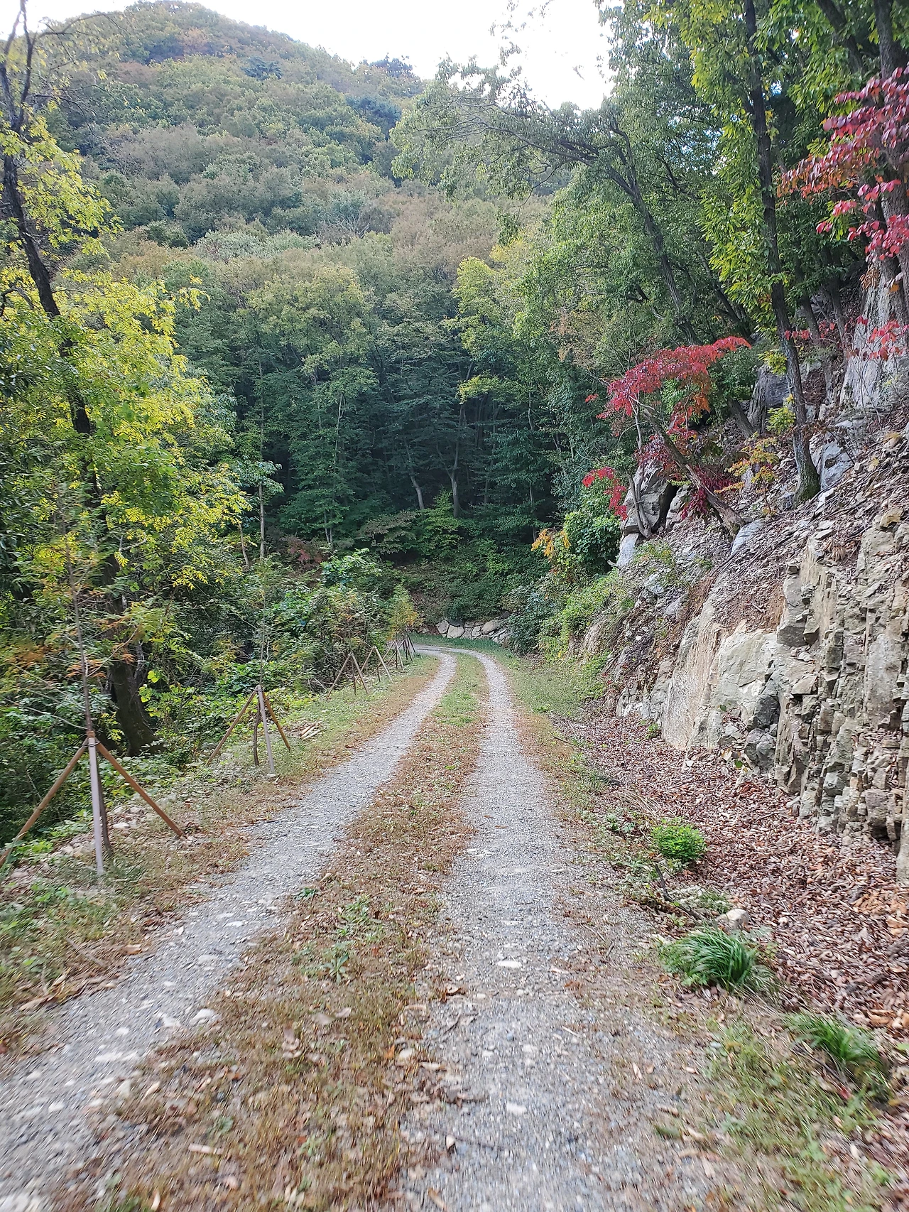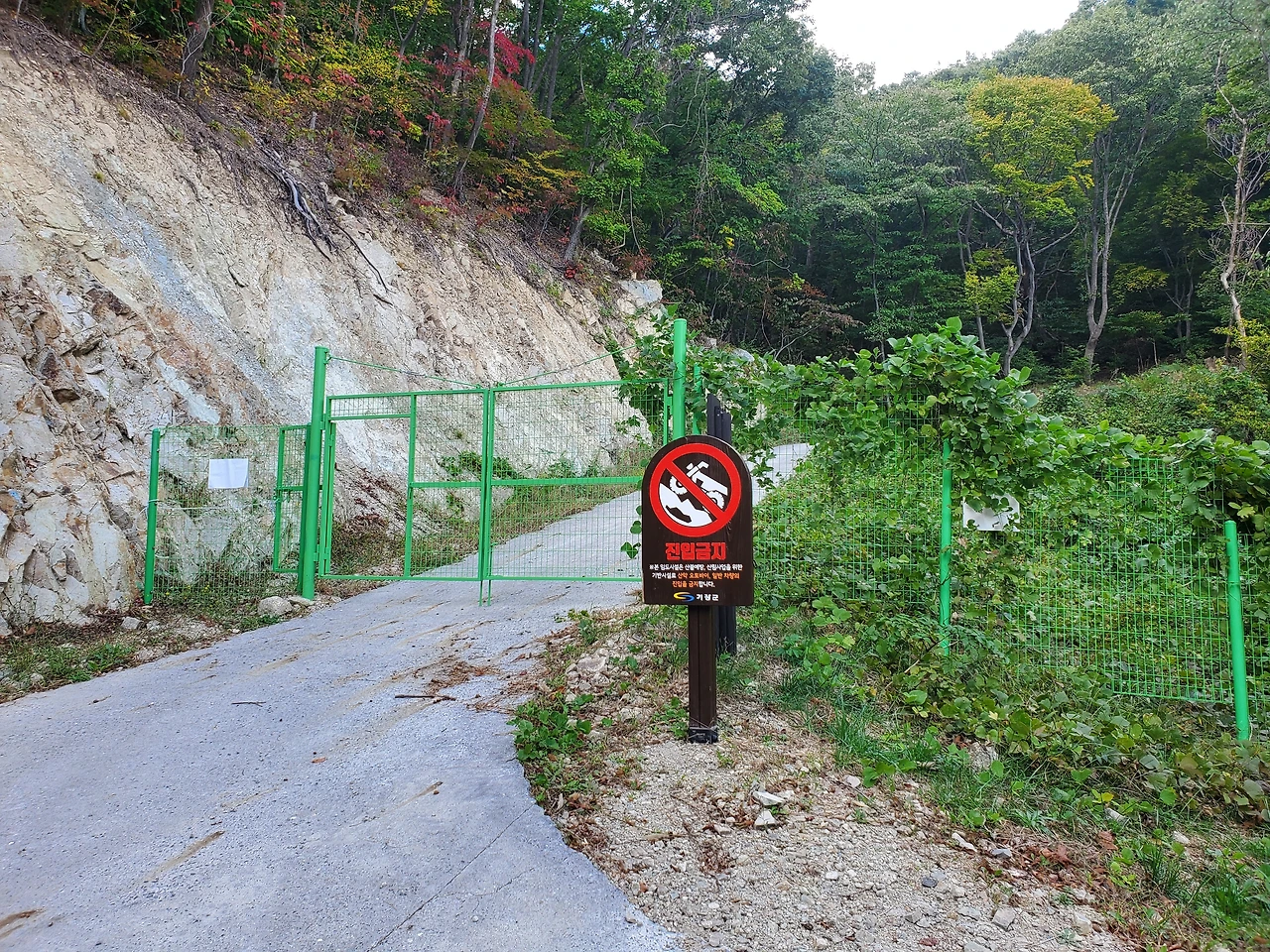 임도는 새로 조성된 듯했다. 가파른 경사를 절개하여 조성된 임도는 비가 많이 올 경우 유실될 가능성이 짙어 보였다. 군데군데 이정표도 박아둔 걸 보면 임도를 공개할 계획이 있었던가 보다. 그런데 이 길엔 차량이나 오토바이 진입을 금지하고 있었다.