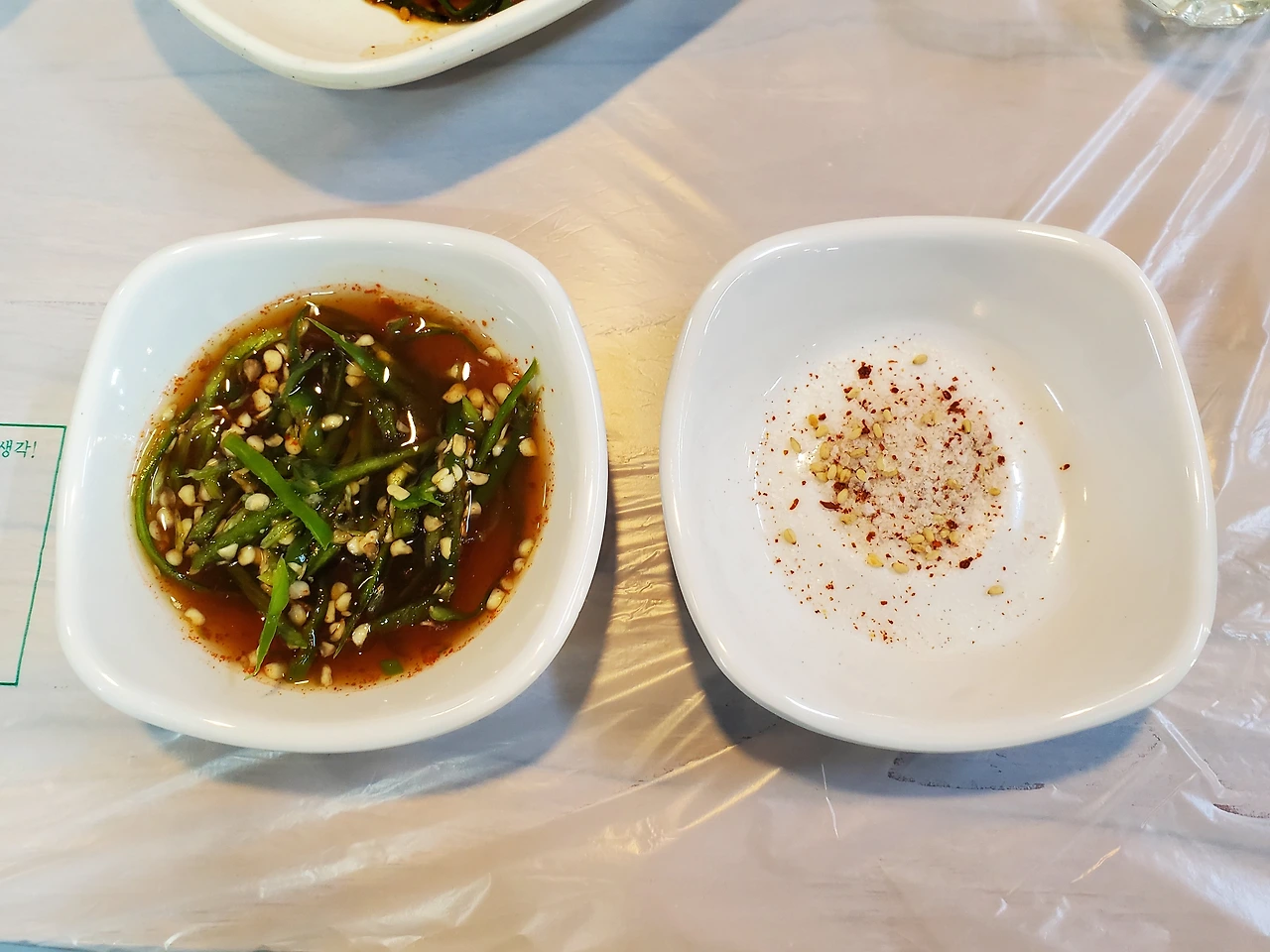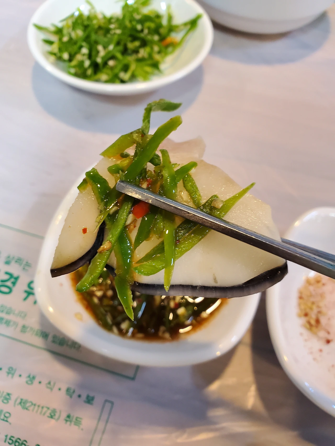 간장에 청양고추를 섞어서 먹는다. 고춧가루 섞인 소금도 있다.