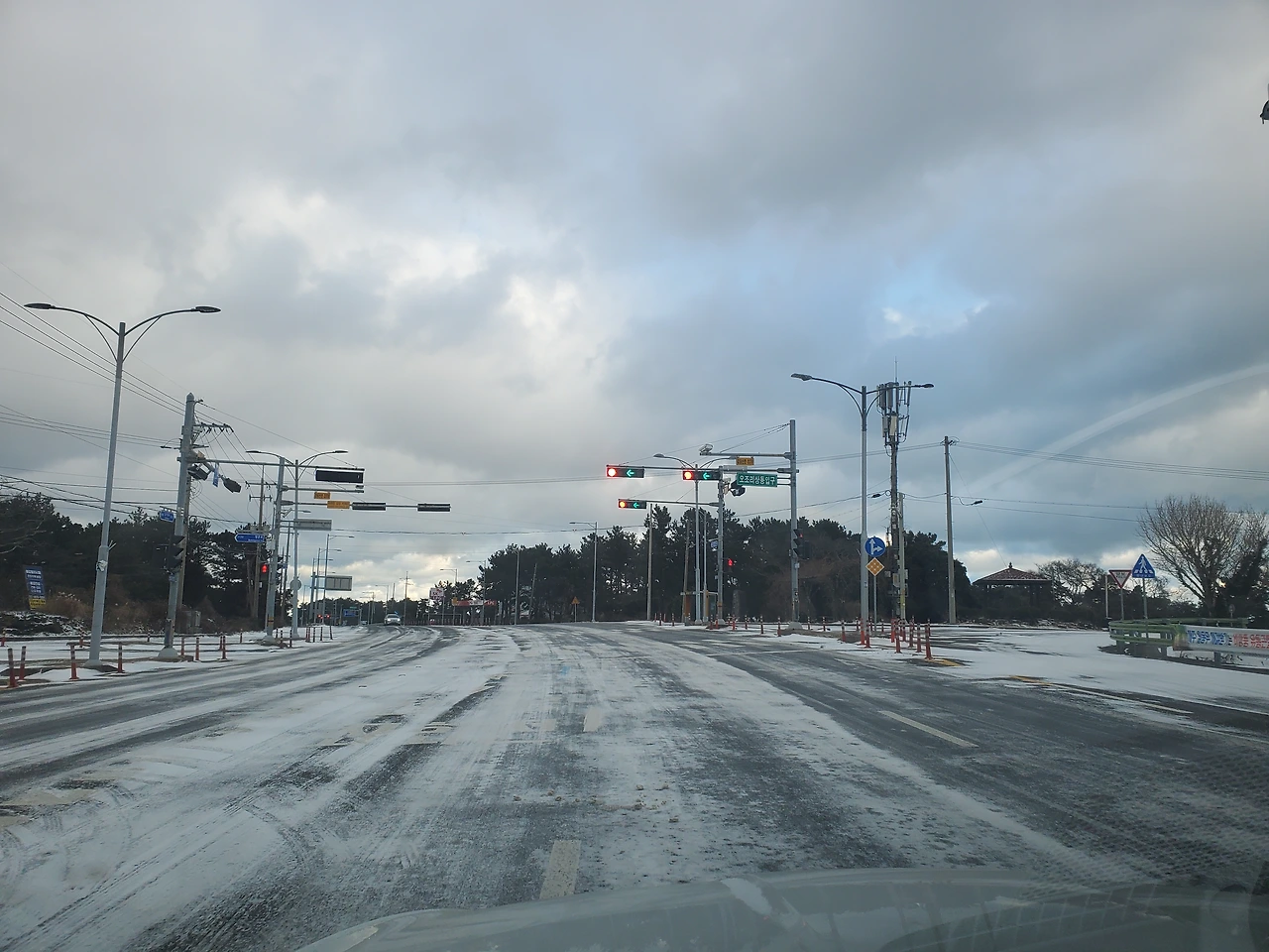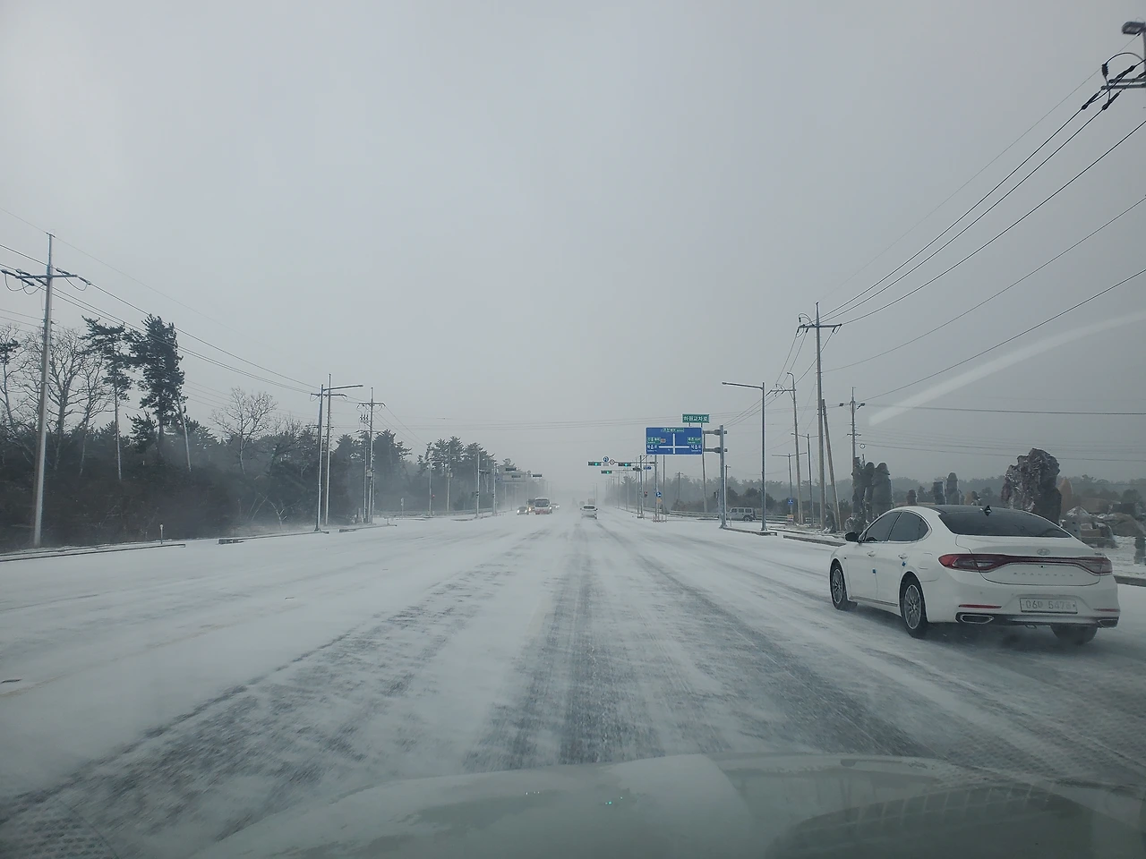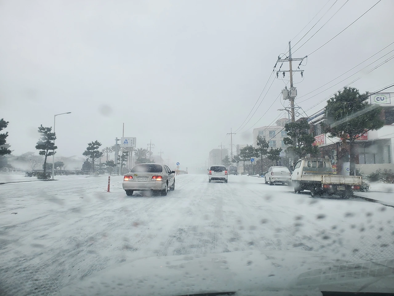 제주시에 들어오니 제설 상황이 좋았지만 차들은 기어 다니고 있었다.