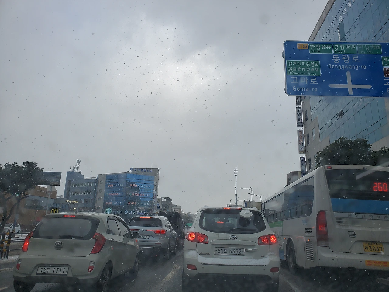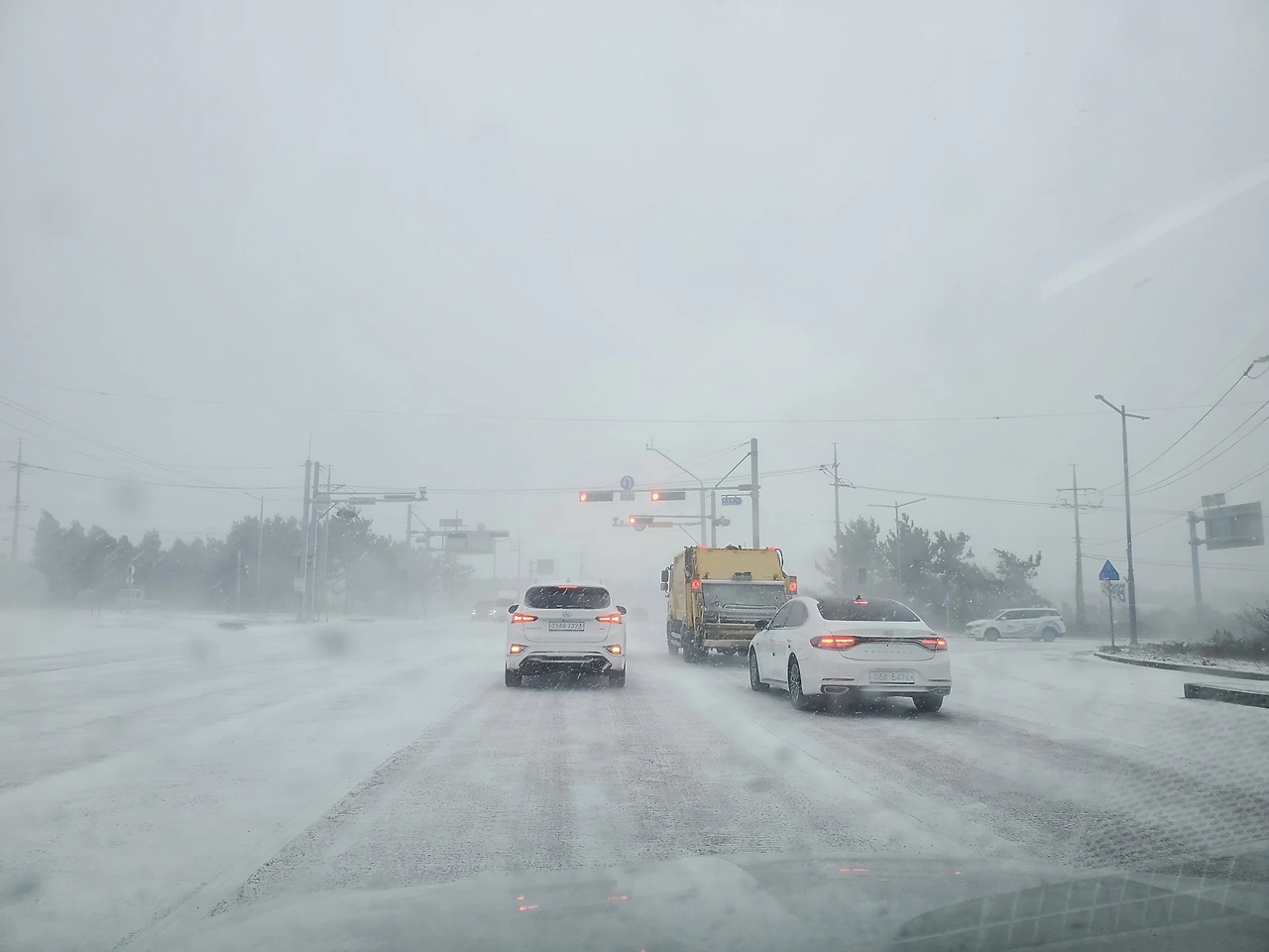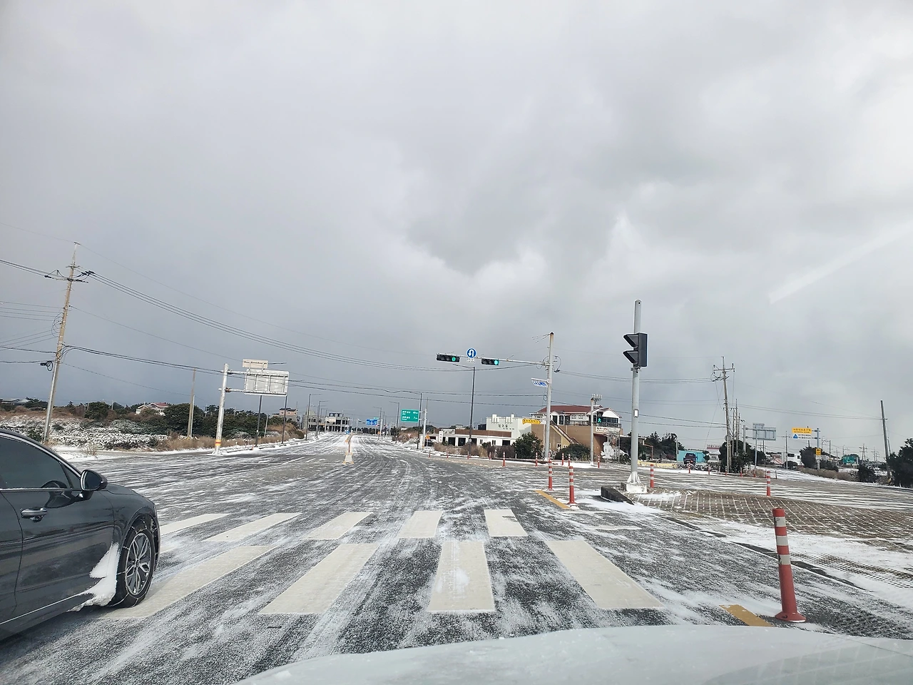 제주시에 들어오니 제설 상황이 좋았지만 차들은 기어 다니고 있었다.