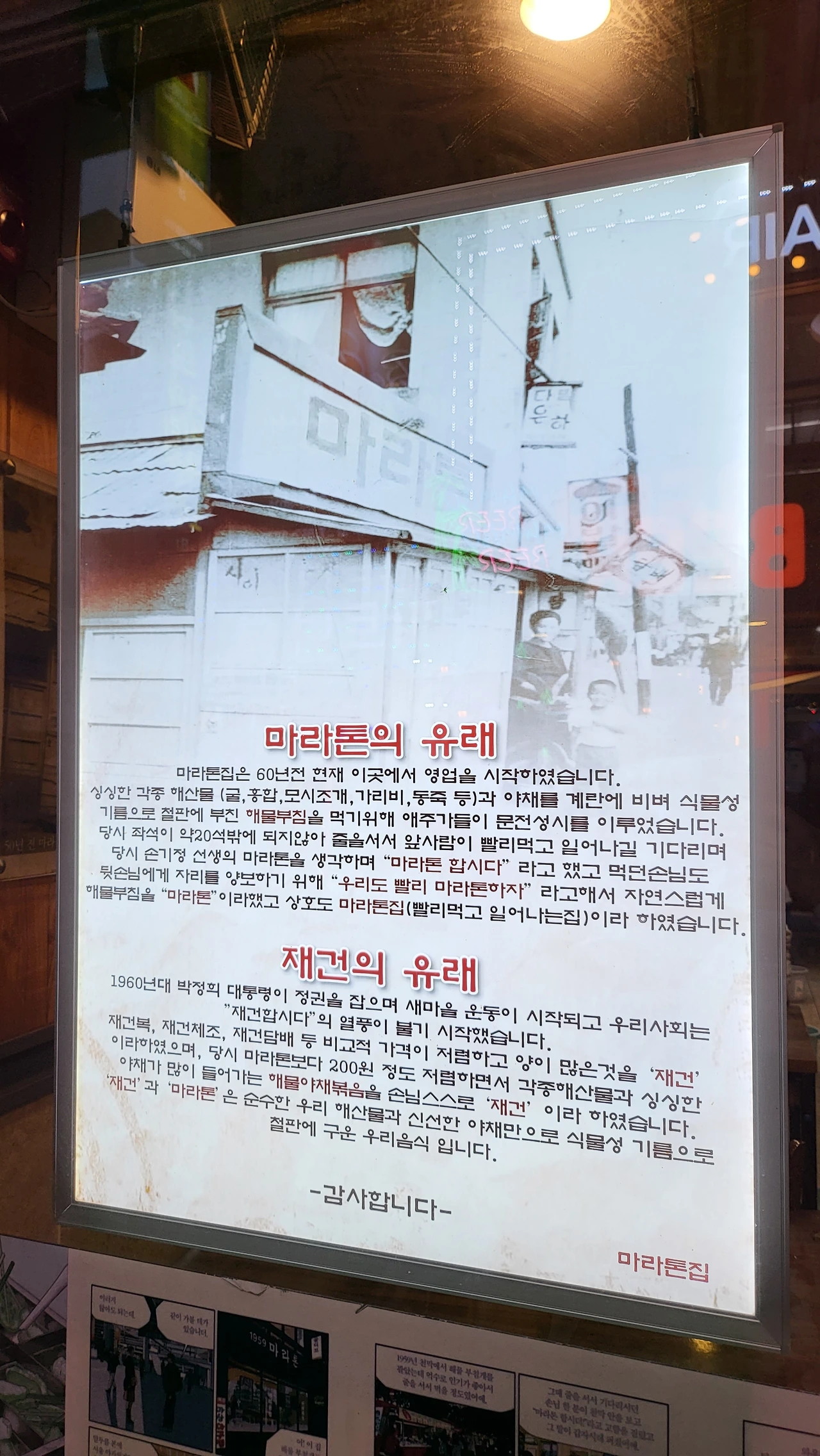 같은 자리에서 영업을 하고 있다는 마라톤집에는 '재건'이라는 메뉴도 있는데 새마을운동 당시 '재건'사업이 한창이었고 값싸고 질 좋은 제품이나 음식에 '재건'이라는 단어를 흔히 붙여 쓰곤 했다.