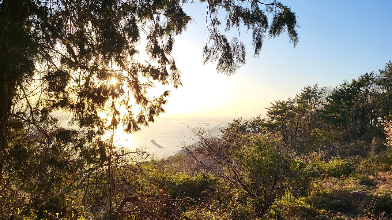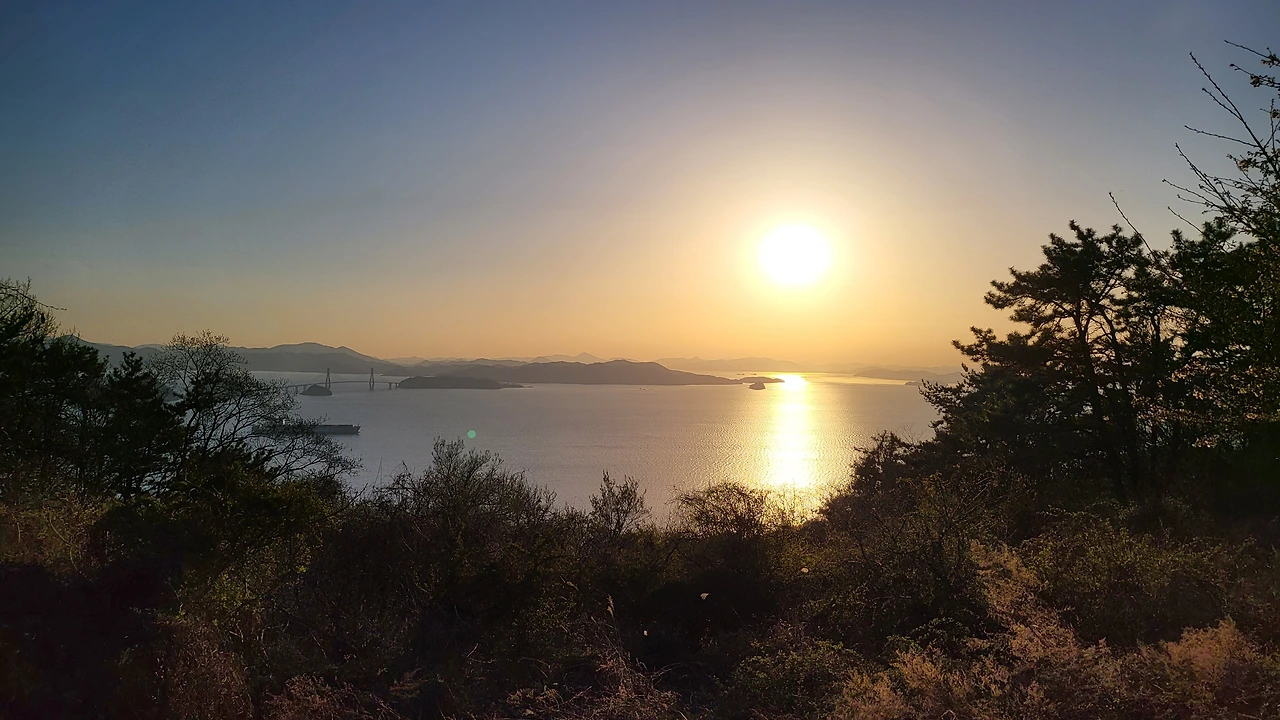 멀리 거제도 뒤로 떨어지는 낙조 감상도 하며...