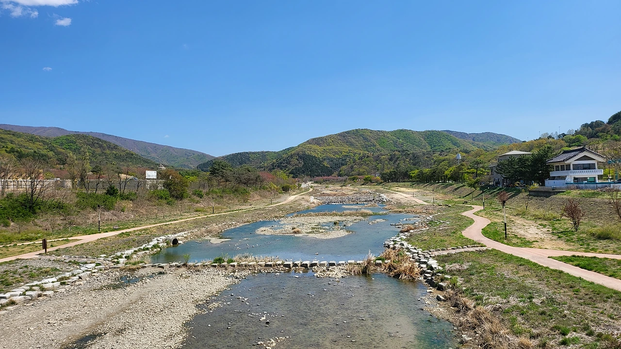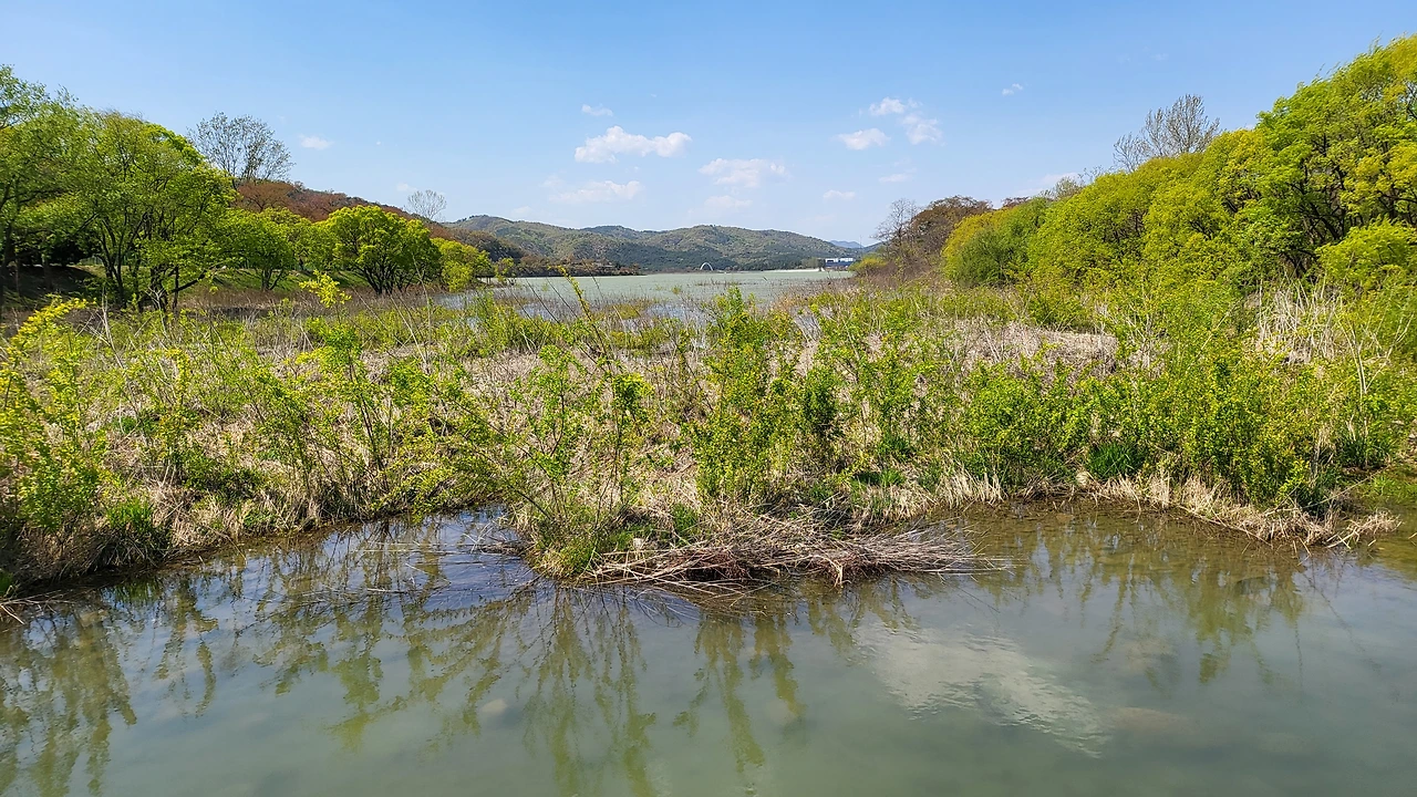 초봄의 푸릇한 산과 저수지 색이 너무 잘 어울린다.
