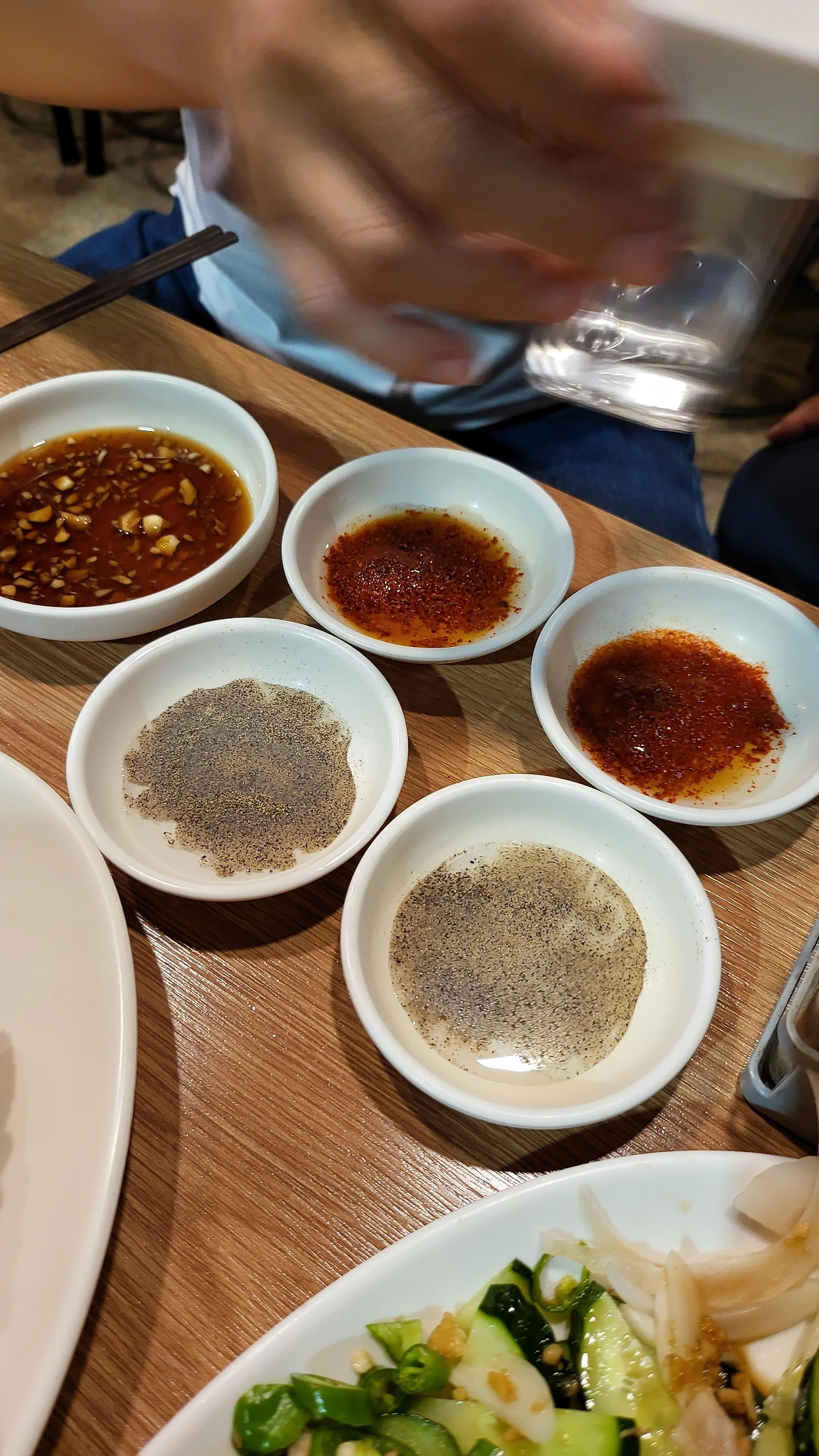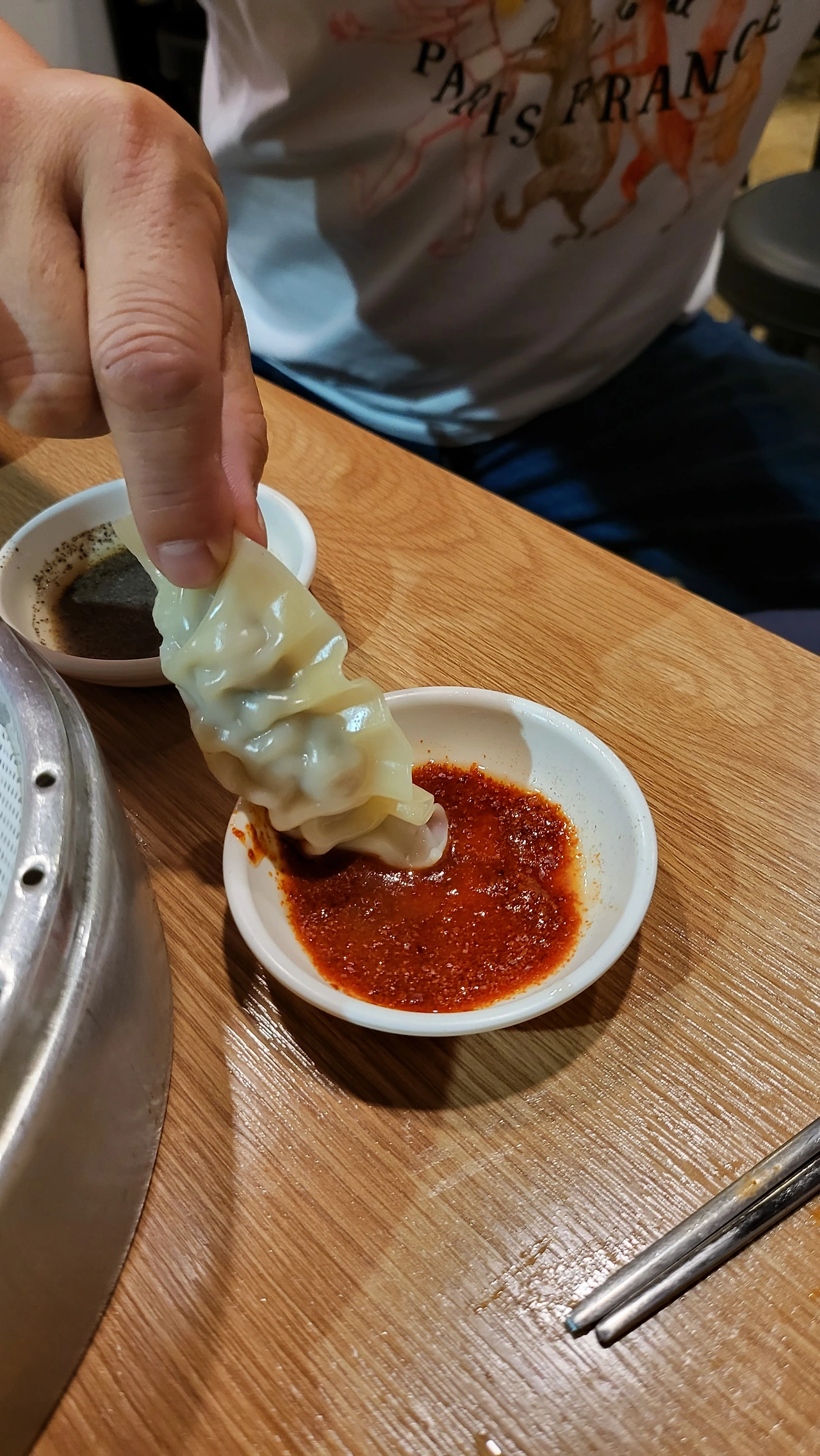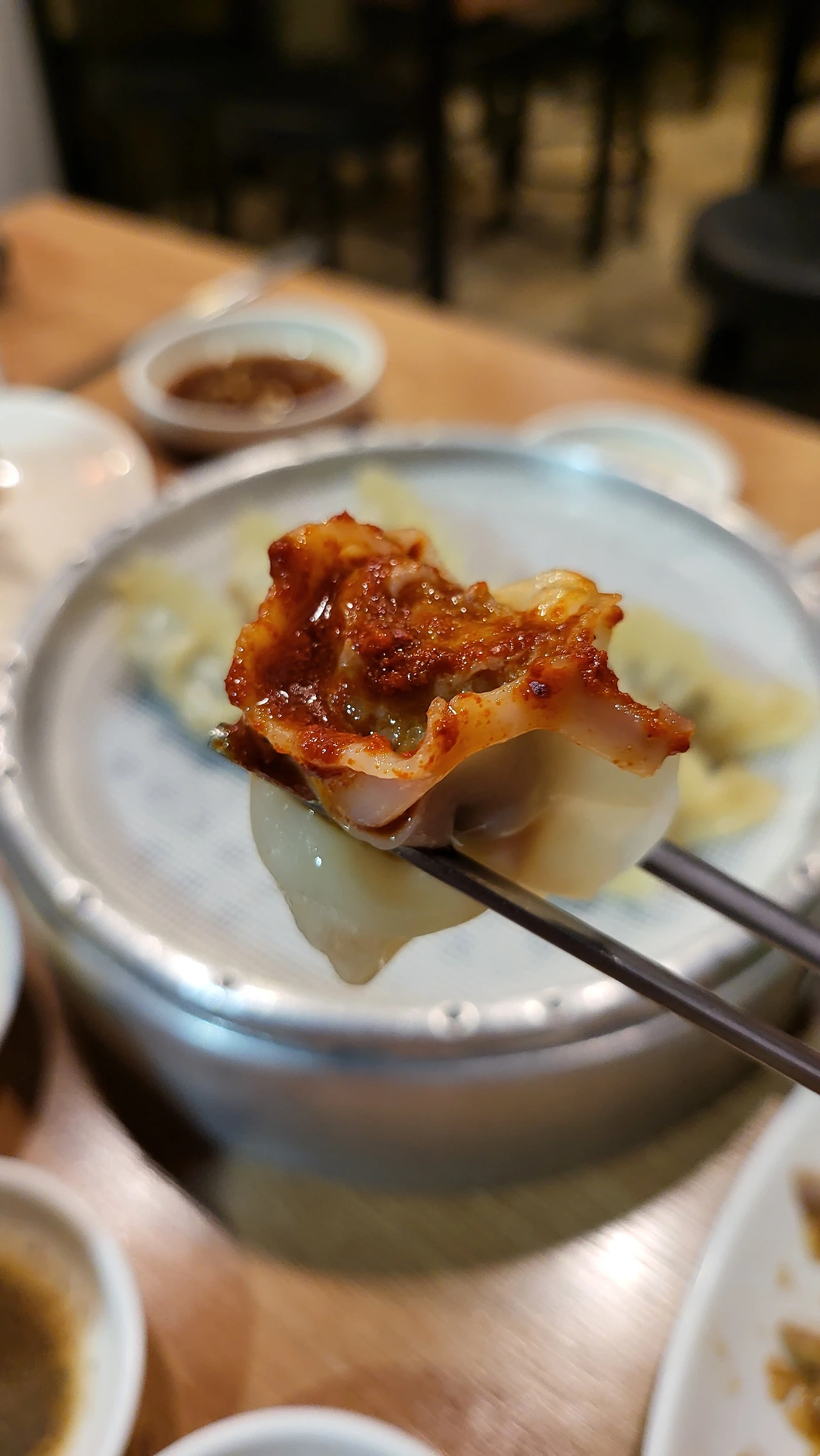 이번엔 찐만두용 소스에 고춧가루가 과하다 싶을 정도로 푹 찍어 먹는다.