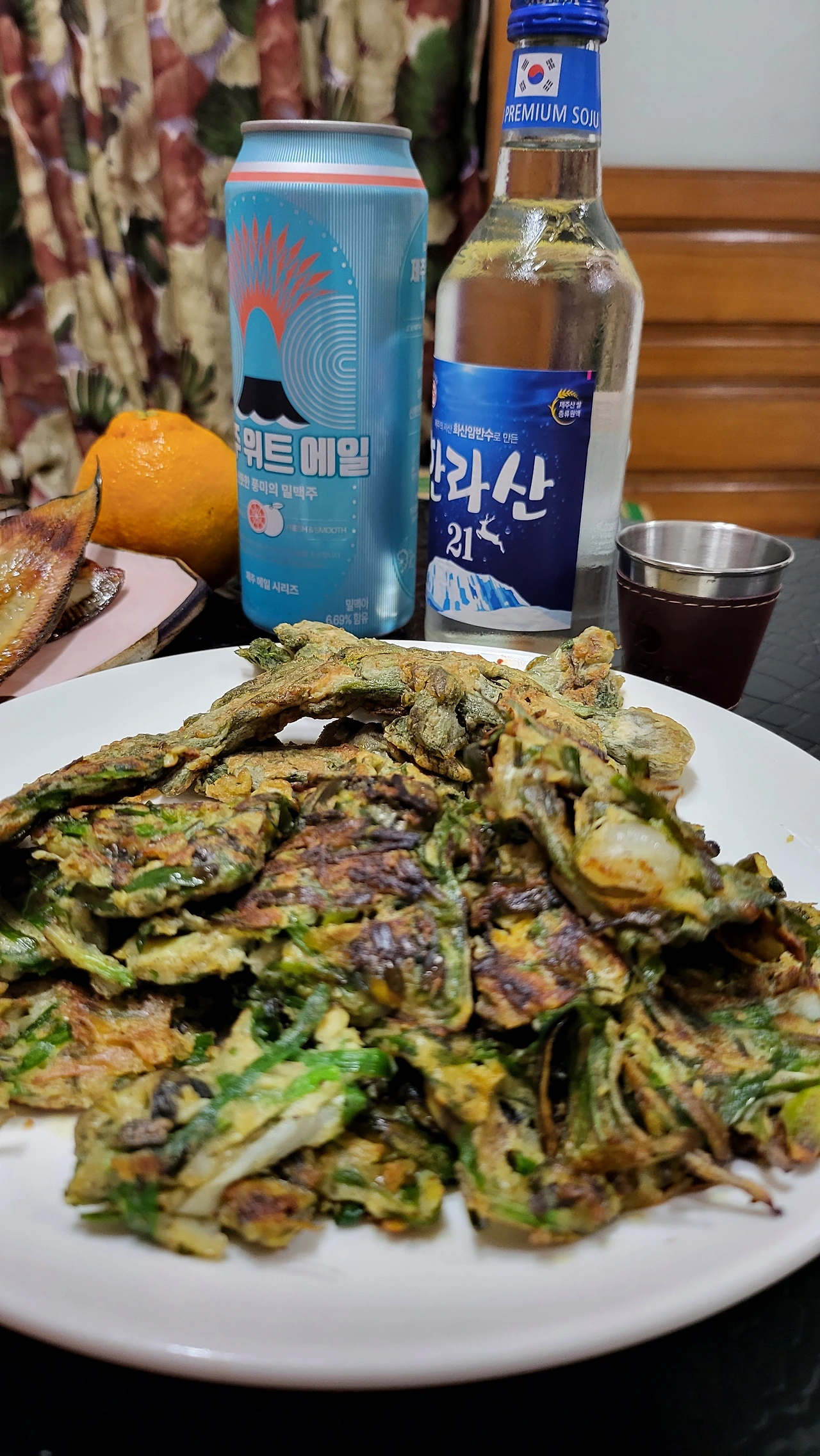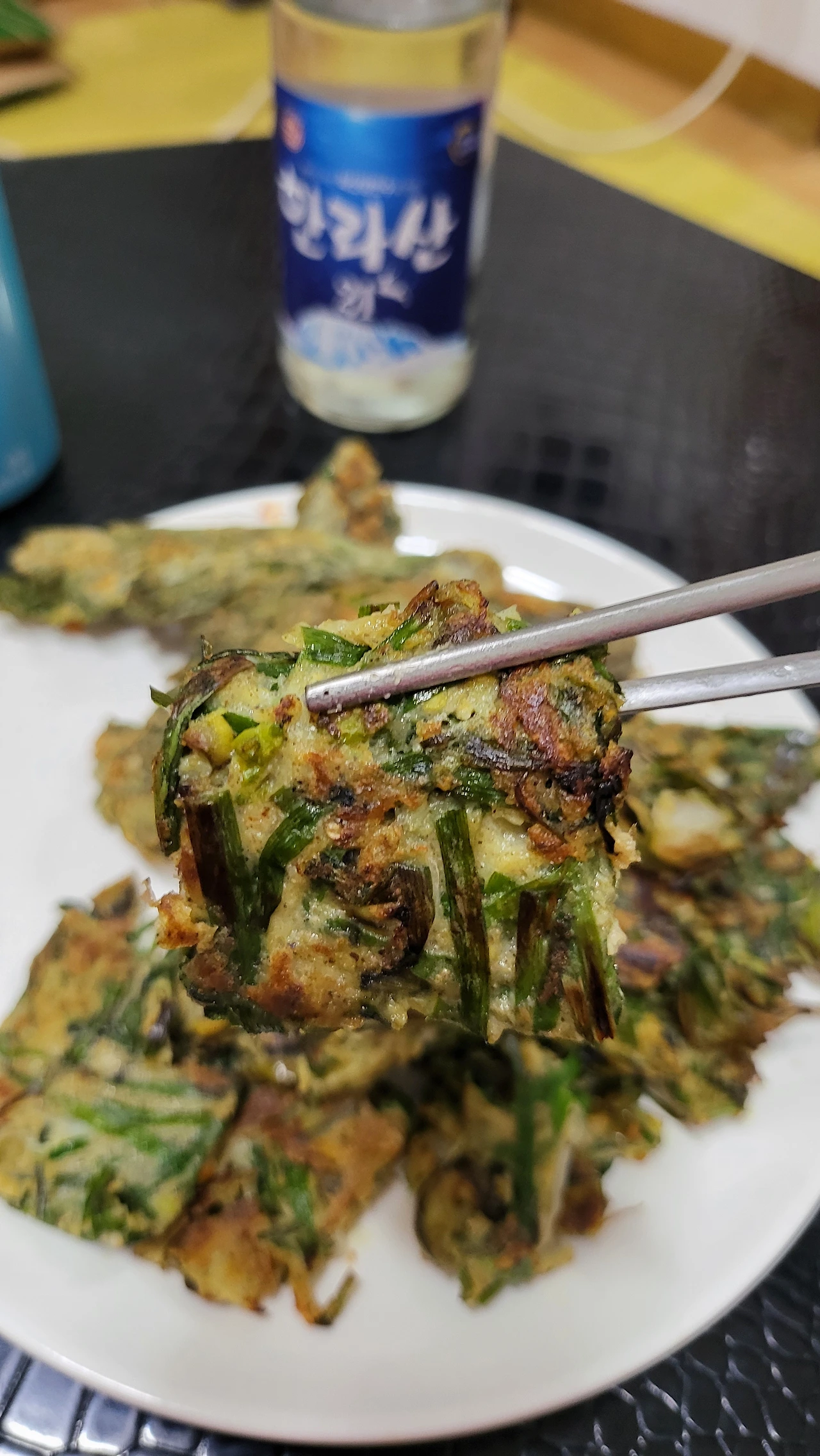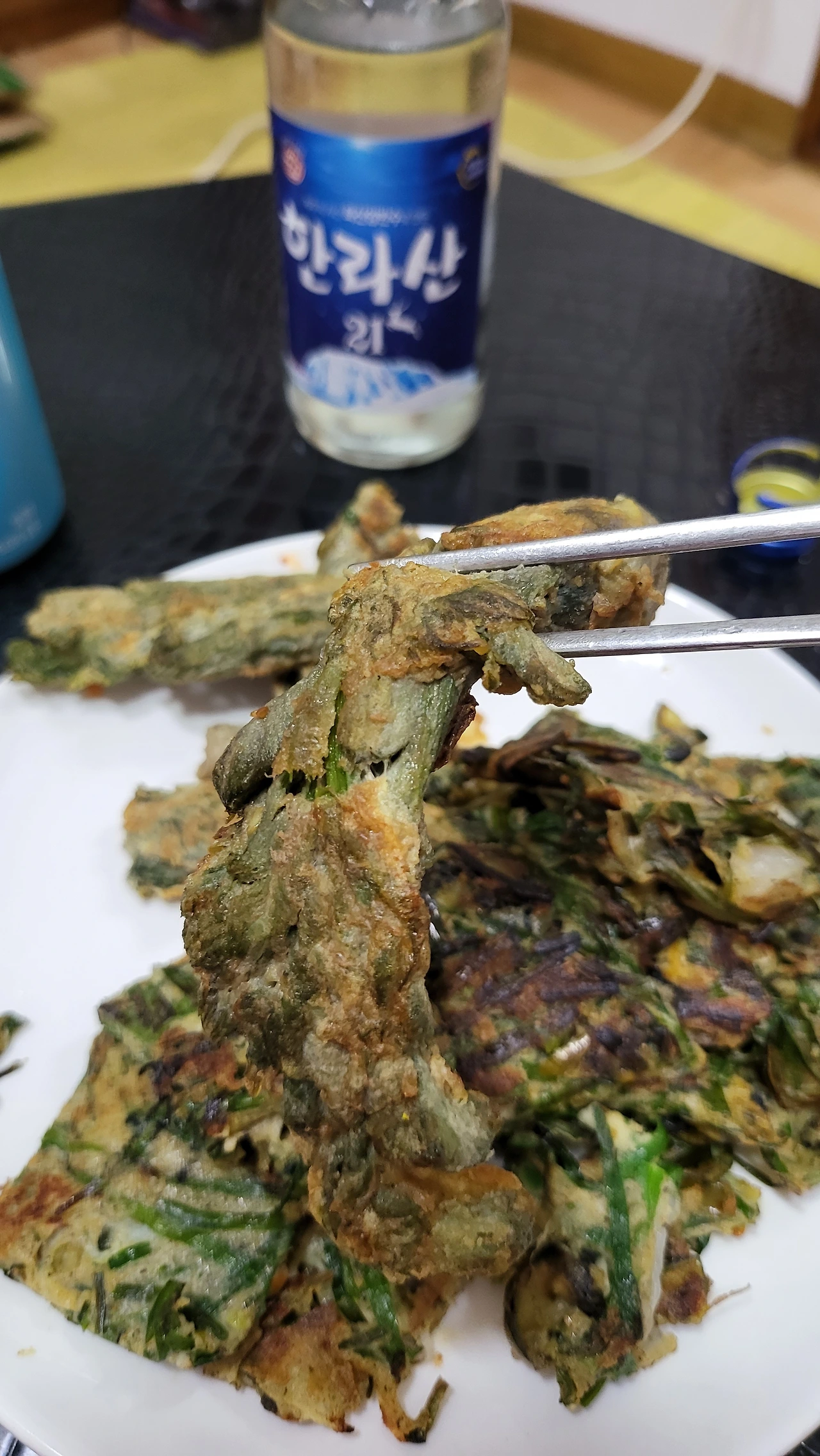 직접 뜯은 두릅으로 전을 부쳐 주셨고 직접 키운 부추와 역시 직접 잡은 보말로 부추전을 부쳐 주셨다.