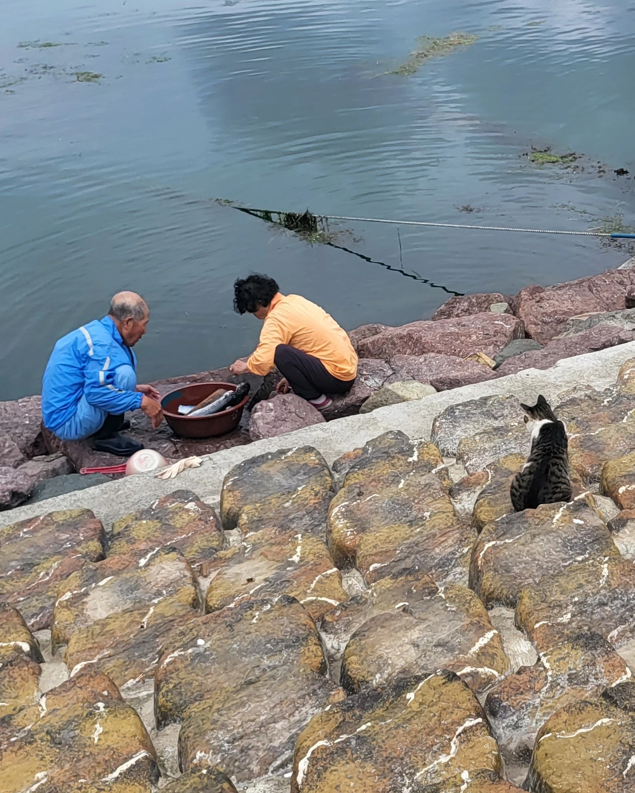 나오는 길에 바닷가에서 숭어 배를 가르고 있는 노부부의 모습을 지켜보는 고양이.