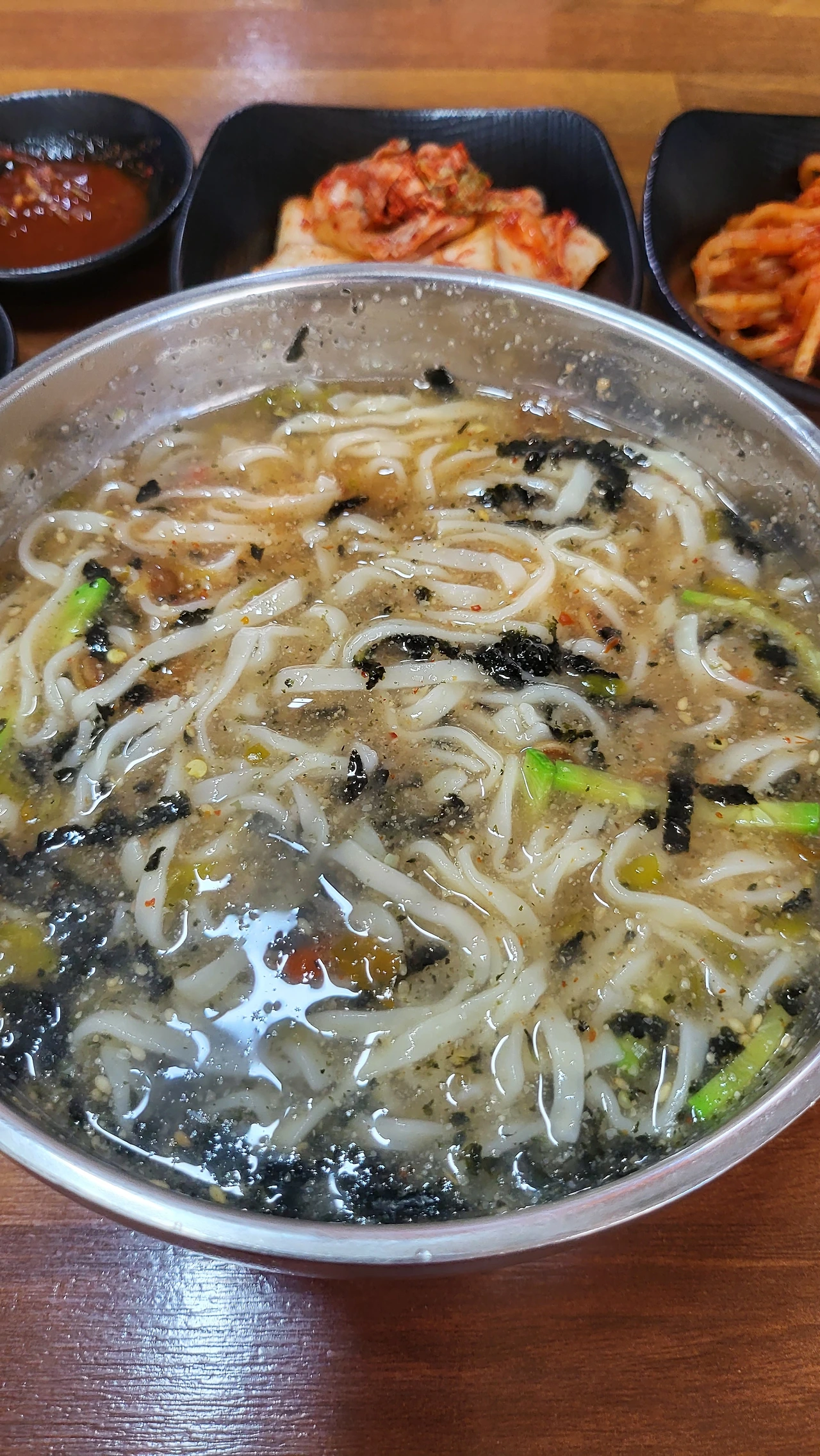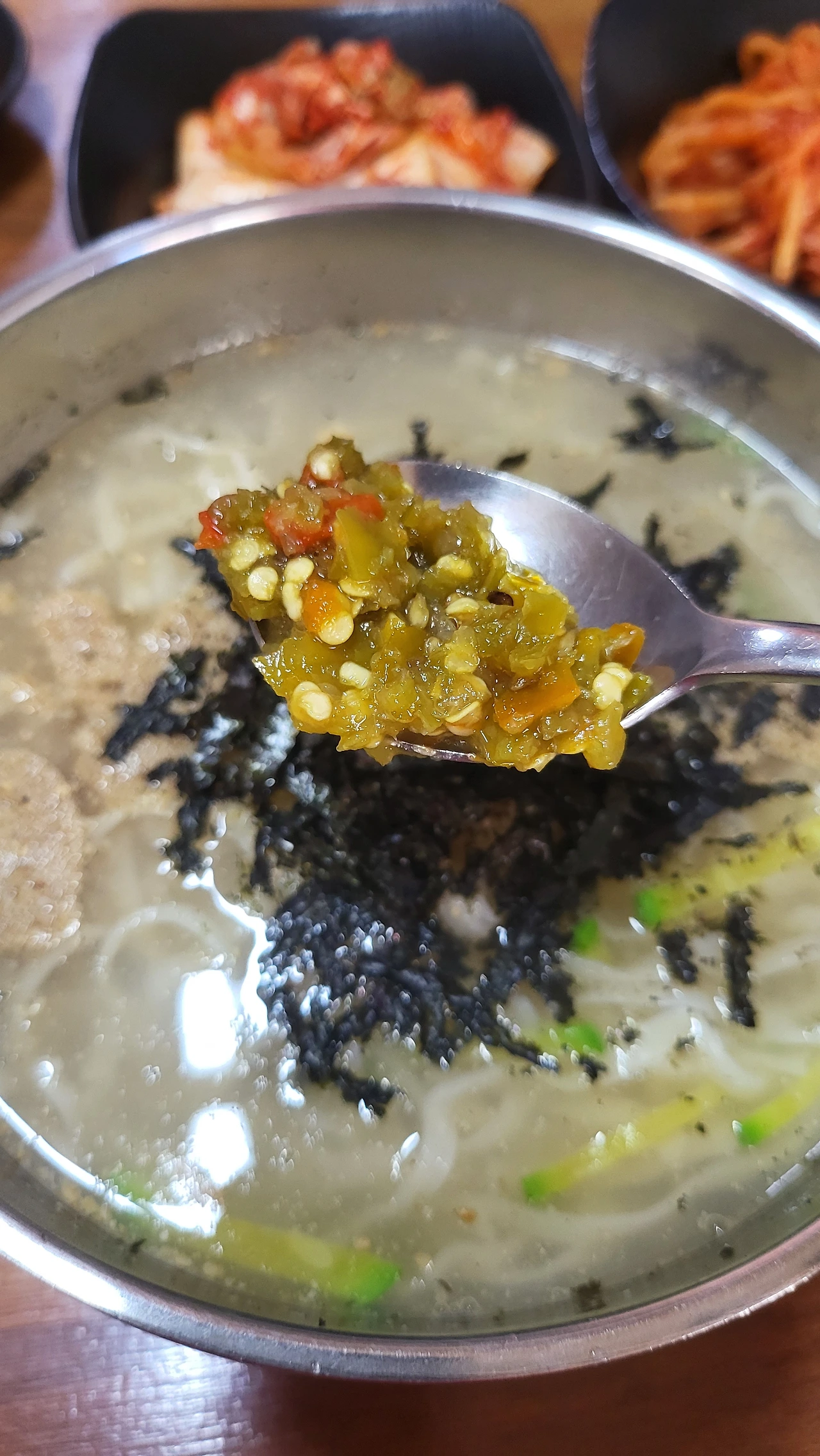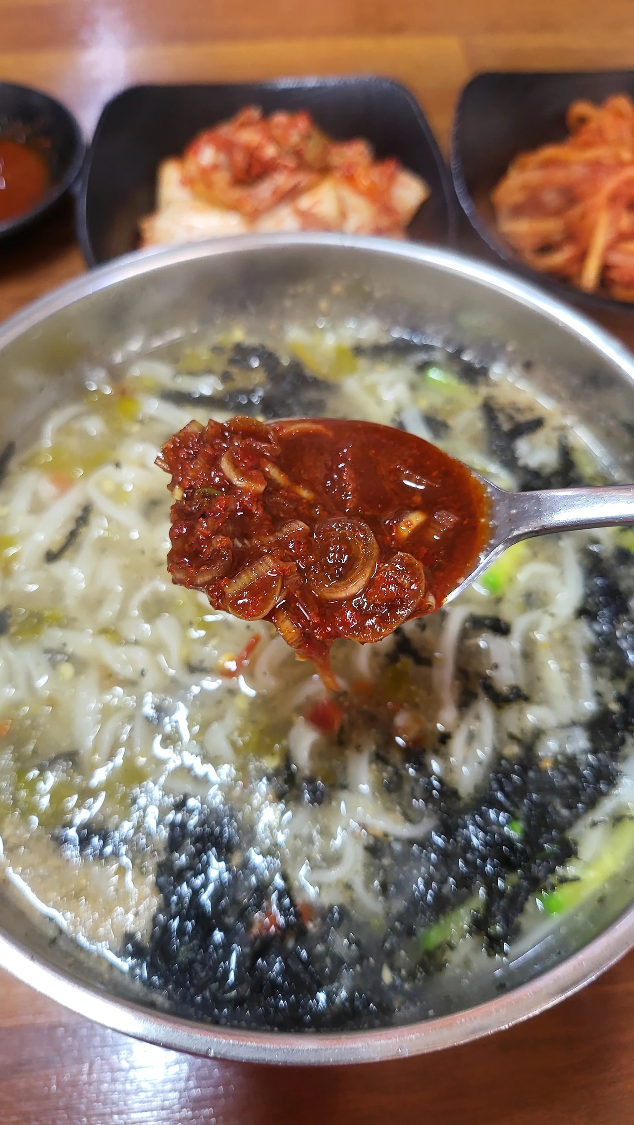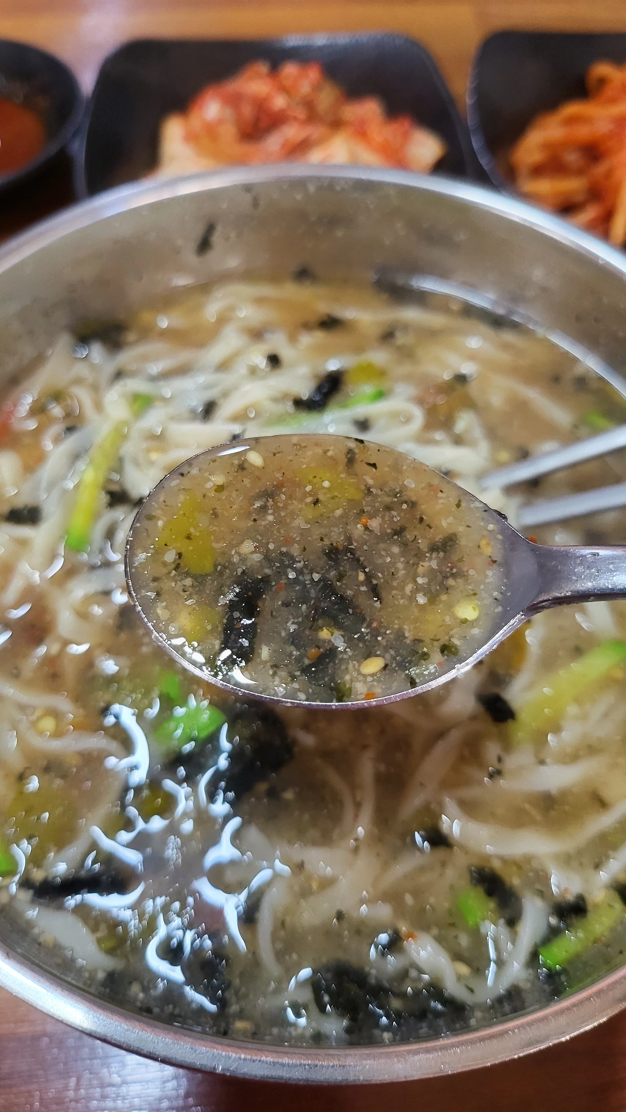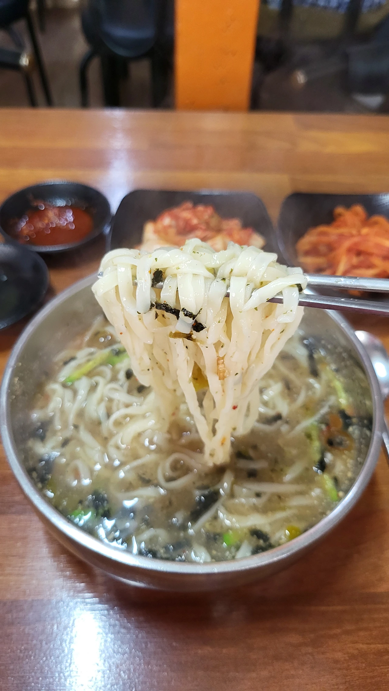 김치 양념이 칼국수 국물과 섞이며 조금씩 깊은 맛으로 물들어 간다.