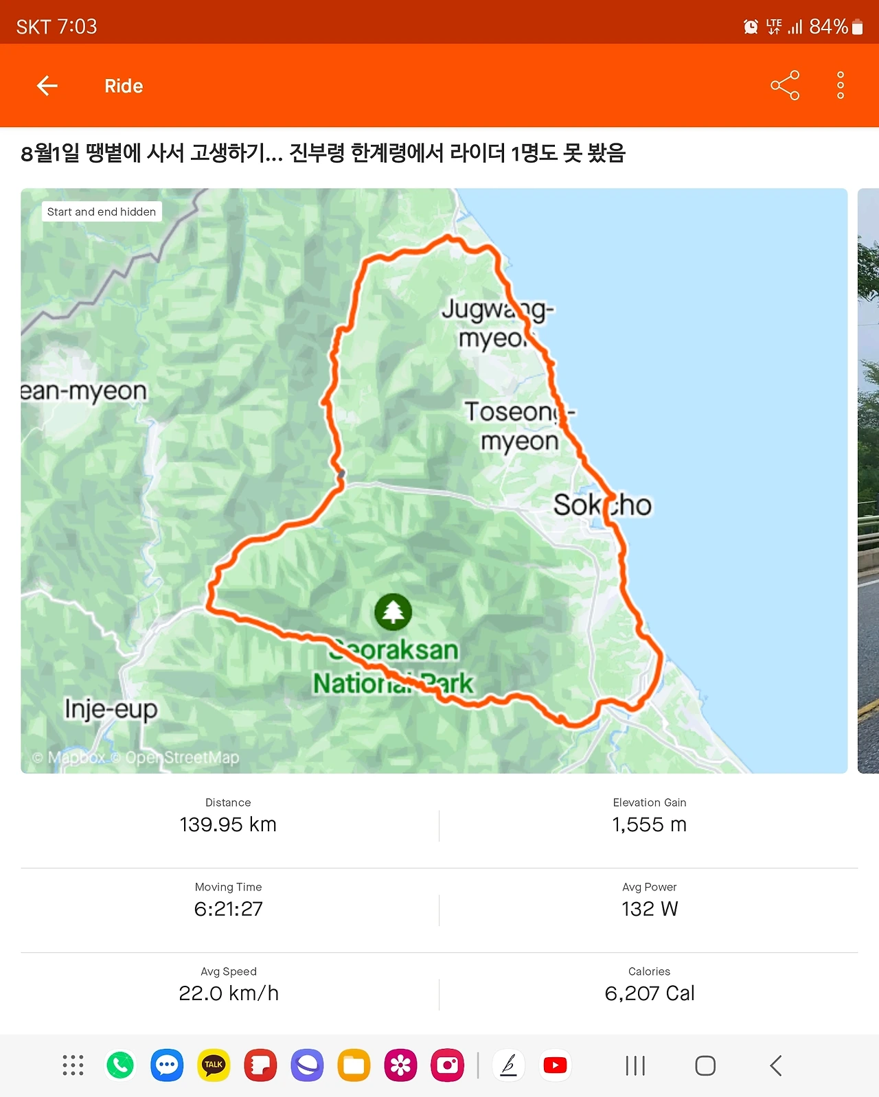 중간에 1박을 하고 올라오는 중이라는데 전날의 뜨거운 땡볕에도 불구하고 라이딩을 하다니... 대단한 분이다.
