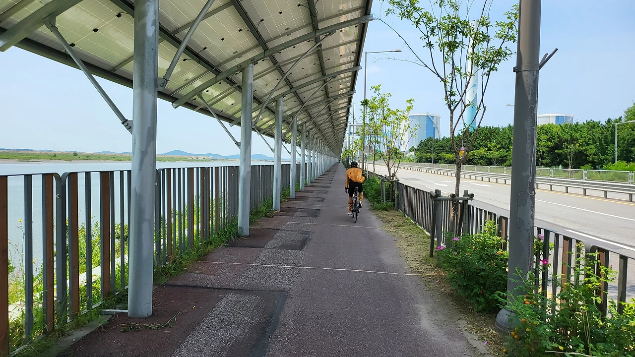 낙타등 코스를 빠져나와 시화교를 건너니 태양광발전용으로 설치된 그늘막이 길게 이어졌다.