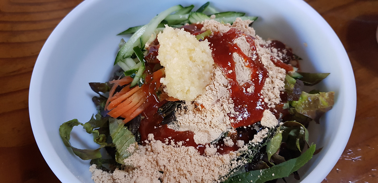 상추, 깻잎, 오이, 당근을 넣고 콩가루와 초장 그리고 들기름을 버무린다.